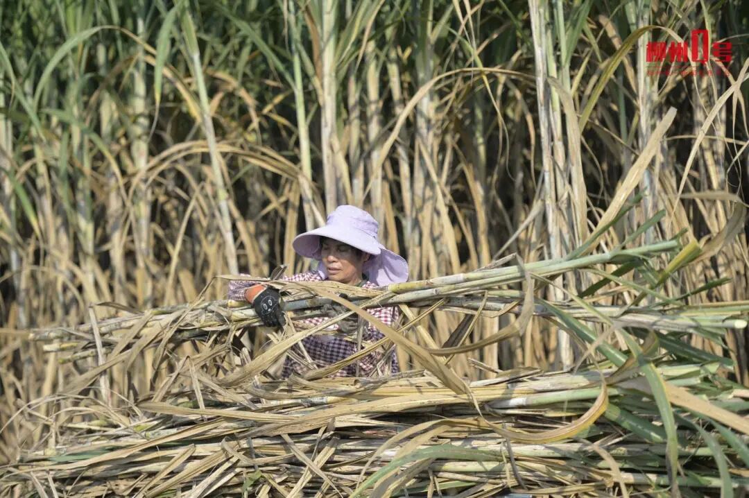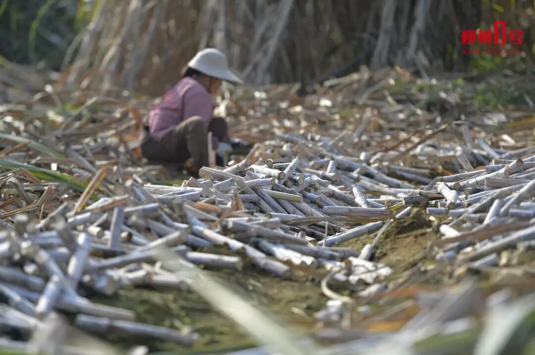 12月18日,在柳南区洛满镇凤山村的甘蔗种植基地里,一派繁忙景象。村民们穿梭于蔗林间,熟练地收割、修整,将甘蔗秆切割成标准的“双芽段”。