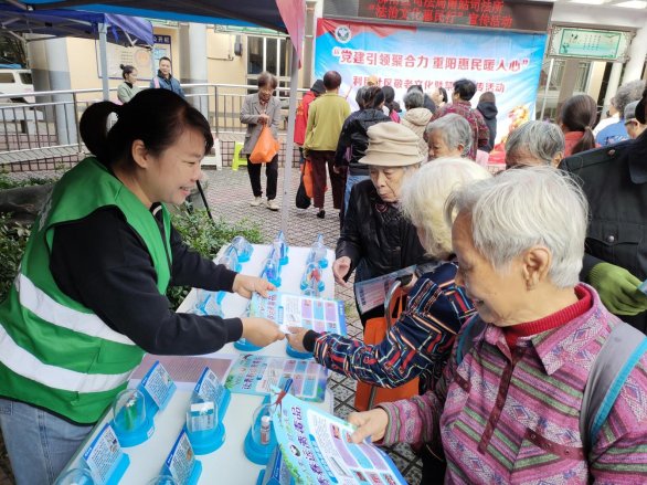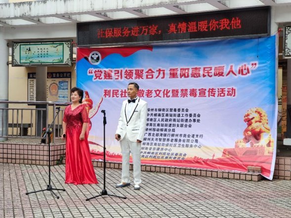 金秋送爽,丹桂飘香。在2025年重阳节即将来临之际,为大力弘扬中华民族尊老、敬老、爱老、助老的传统美德,同时筑牢社区禁毒防线,10月23日,柳南区南站街道利民社区在鹅岗路一区物业站小广场成功举办了以“党建引领聚合力,重阳惠民暖人心”为主题的重阳节敬老文化暨禁毒宣传活动。活动吸引了众多社区居民参与,现场洋溢着温馨和谐、其乐融融的节日氛围。