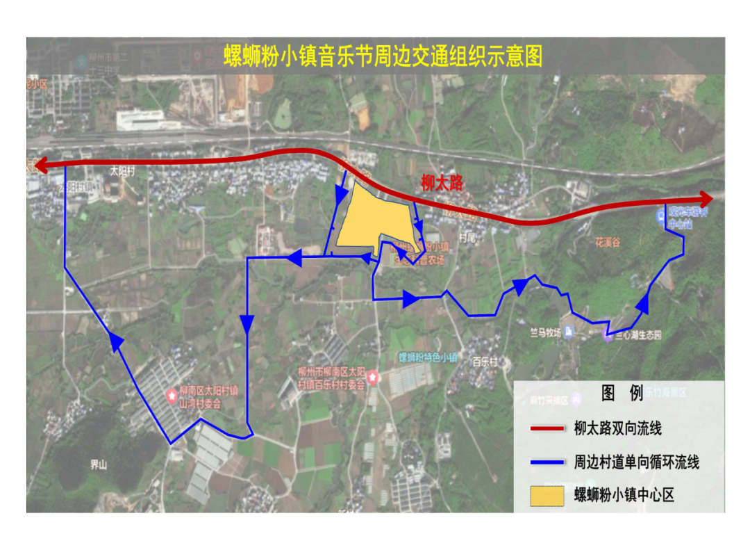 二、2025年12月5日8时至12月8日凌晨2时音乐节结束人员疏散完毕,对螺蛳粉小镇周边部分村道(不含柳太路)实行单向通行(附图1)。
