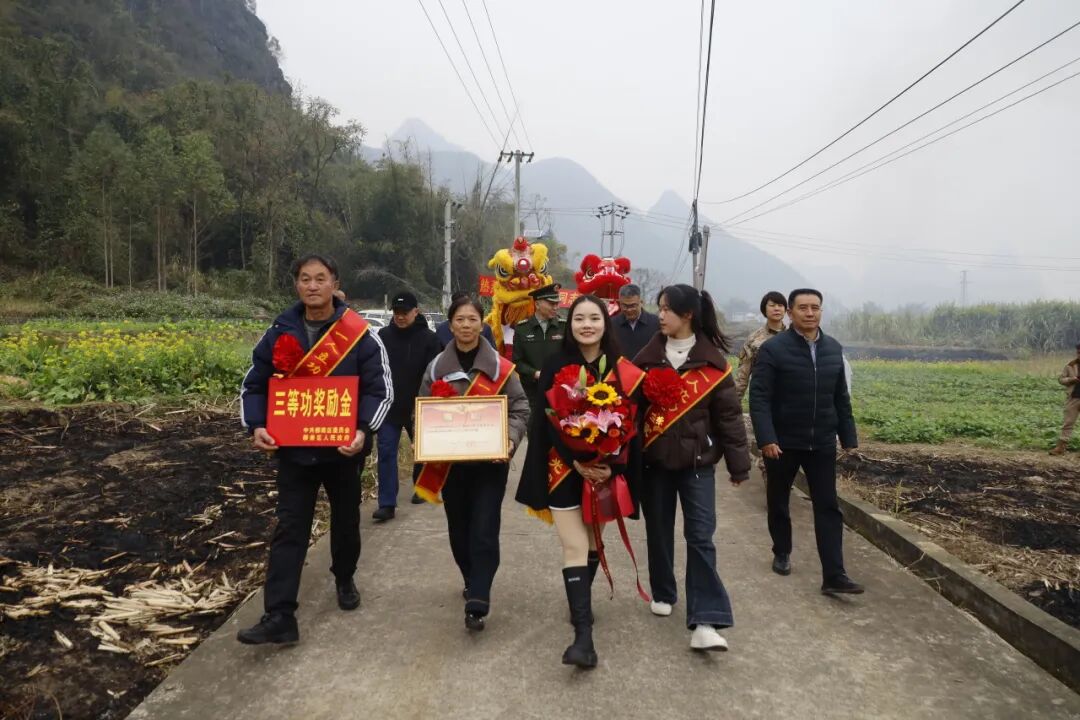 在流山镇广荣村,送喜报队伍敲锣打鼓、醒狮开道,为军属佩戴绶带、献上鲜花,护送荣誉牌匾与立功喜报至家中,喜庆的场面引来乡亲们围观称赞。韦海师2017年入伍,在部队表现优异,于2022年,2025年分别荣立三等功,2020年、2022年荣获“优秀士兵”。在场群众衷心祝贺功臣家属,共同分享这份荣耀和喜悦。