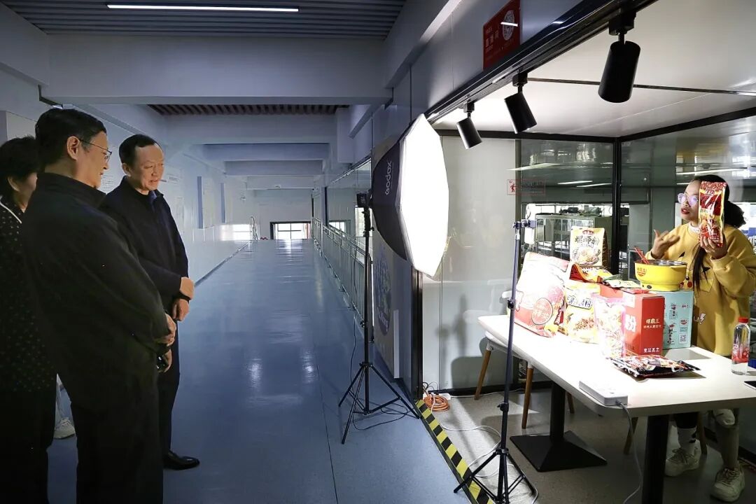 调研组一行在广西螺霸王食品科技有限公司生产车间观看残疾人直播售卖螺蛳粉