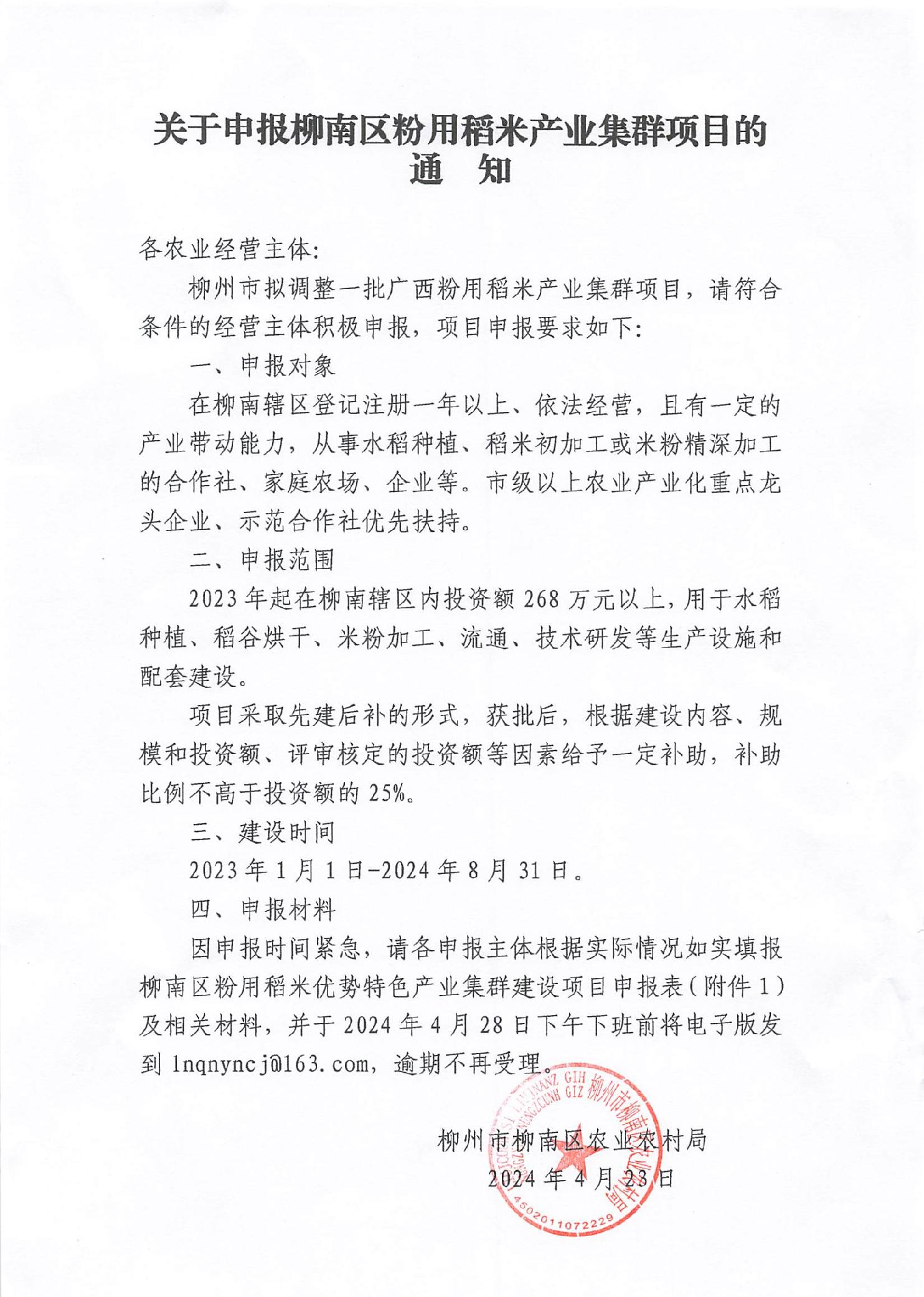 关于申报柳南区粉用稻米产业集群项目的通知2024.4.23