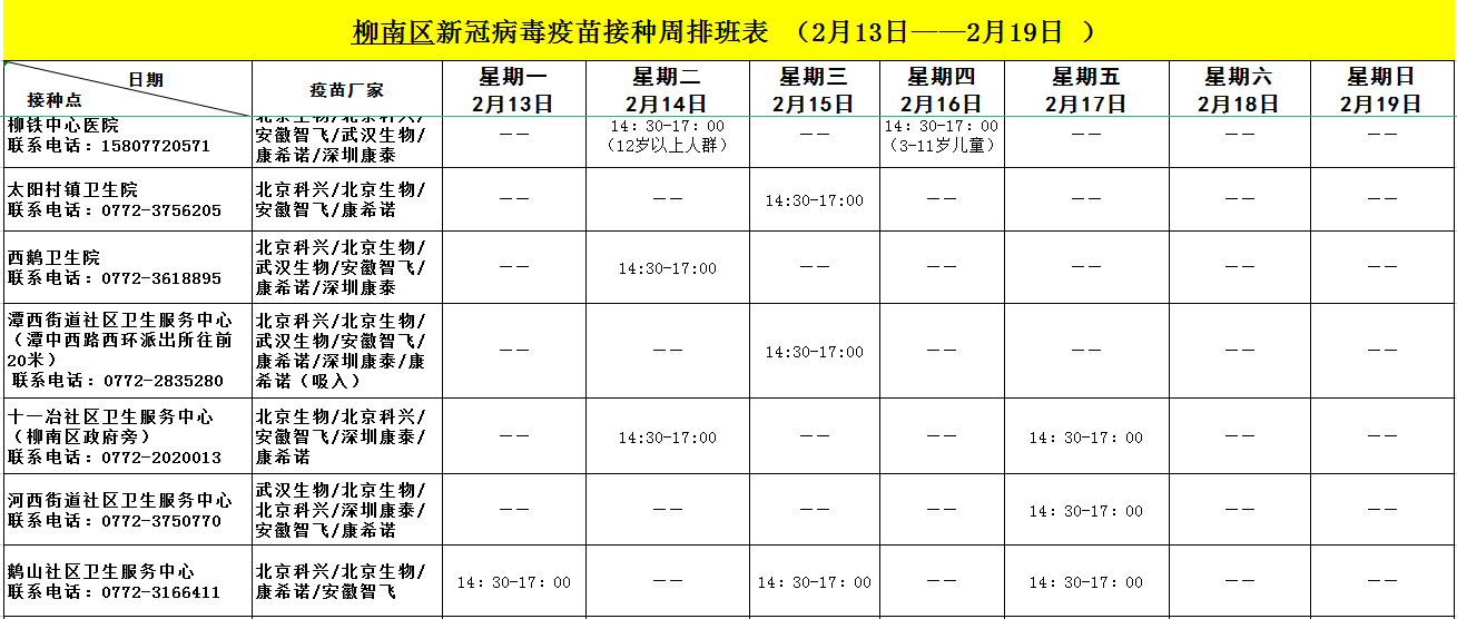 柳南区新冠病毒疫苗接种周排班表(2月13日—2月19日)