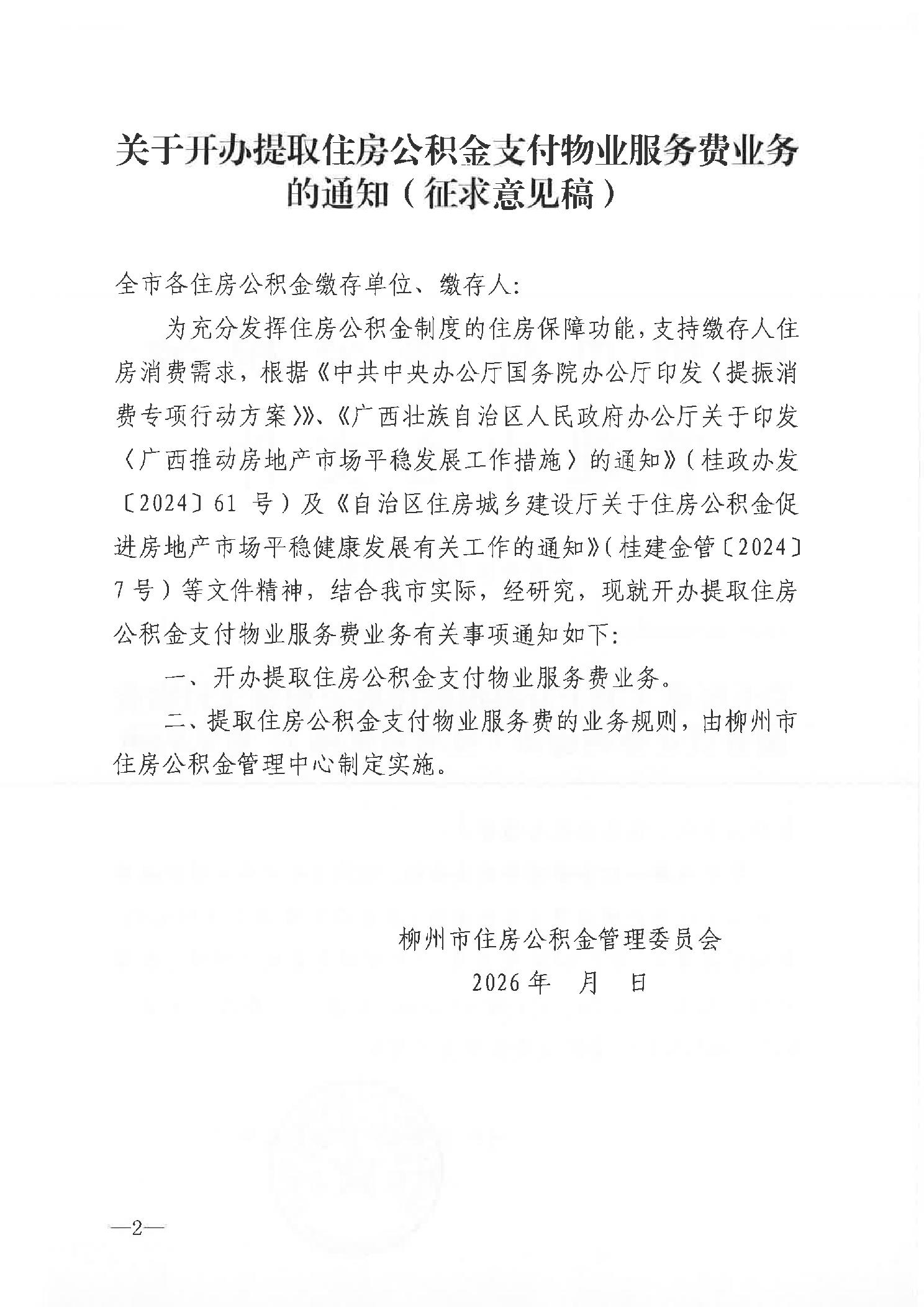 柳房金函〔2026〕3号关于征求《关于开办提取住房公积金支付物业服务费业务的通知(征求意见稿)》意见的函
