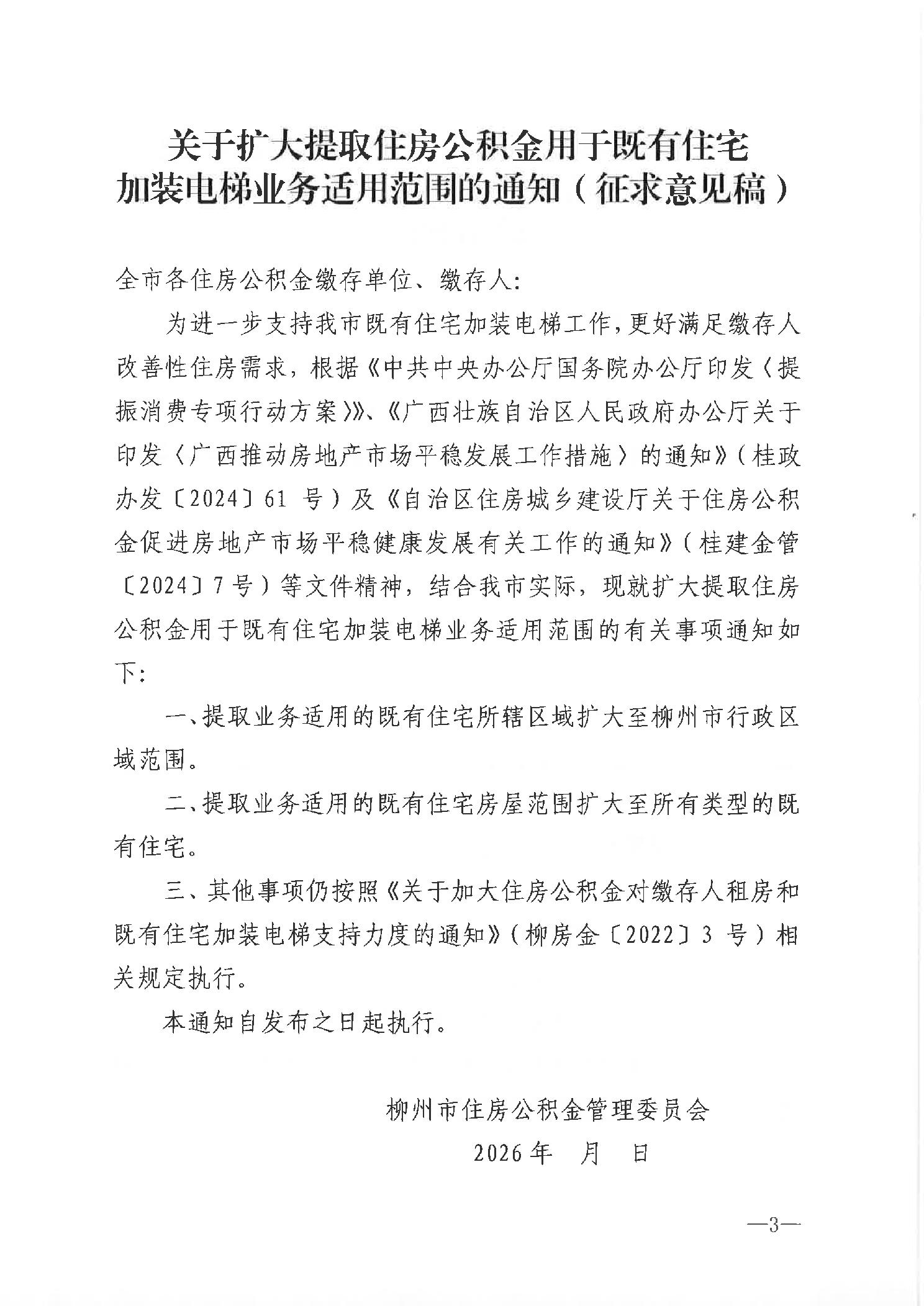 柳房金函〔2026〕6号关于征求《关于扩大提取住房公积金用于既有住宅加装电梯业务适用范围的通知(征求意见稿)》意见的函