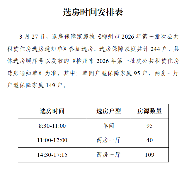 近日,柳州市2026年第一批次公共租赁住房分配公告发布,本批次可分配房源共计548套,拟定于3月27日开展选房。