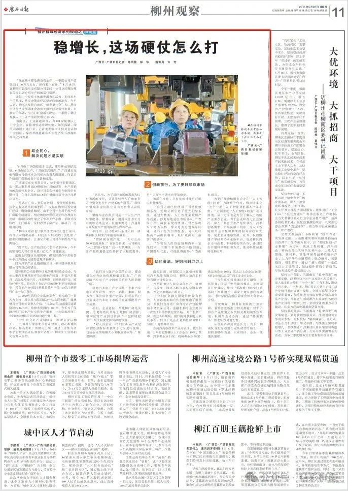 5月22日,《广西日报》刊发《稳增长,这场硬仗怎么打》,跟随记者走进柳南区相关企业和工业园区,探访那些蕴藏在工业经济前行浪潮里的韧劲与力量。原文如下:
