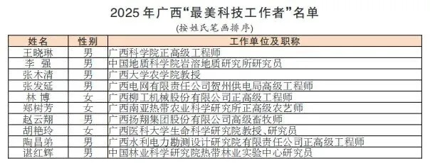 据悉,2025年广西“最美科技工作者”选树宣传活动由自治区党委宣传部、自治区科协、自治区科技厅、自治区工业和信息化厅、广西科学院、自治区农业科学院共同主办。旨在通过深入挖掘一批爱党爱国爱社会主义、坚持科技为民、把论文写在祖国大地上、在“卡脖子”的关键核心技术领域攻坚克难、集智攻关的基层一线优秀科技工作者典型,引导和激励广大科技工作者学习最美、争当最美,为奋力谱写中国式现代化广西篇章贡献智慧和力量。