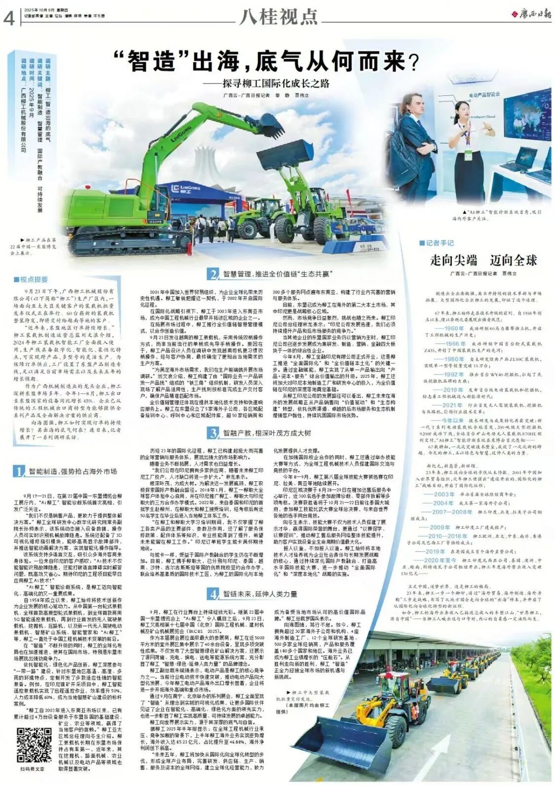 10月9日,《广西日报》第四版整版刊发《“智造”出海,底气从何而来?——探寻柳工国际化成长之路》报道,全文如下: