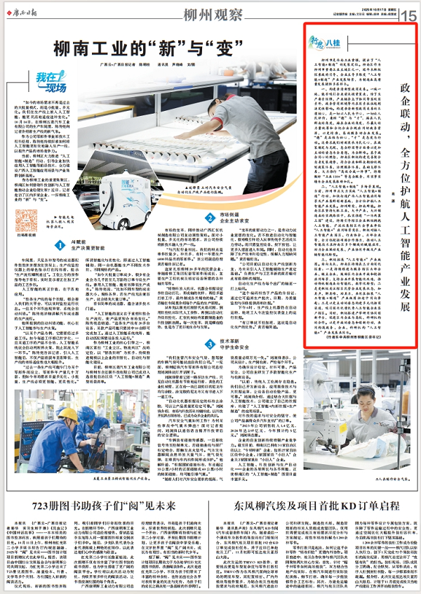 柳州市是西南工业重镇,提出了“人工智能+制造”的发展定位。柳南区作为柳州市重要工业主城区之一,近年来积极探索政府引导、企业主导多维度“人工智能+制造”产业发展场景,为制造业高质量发展提供多层样本。