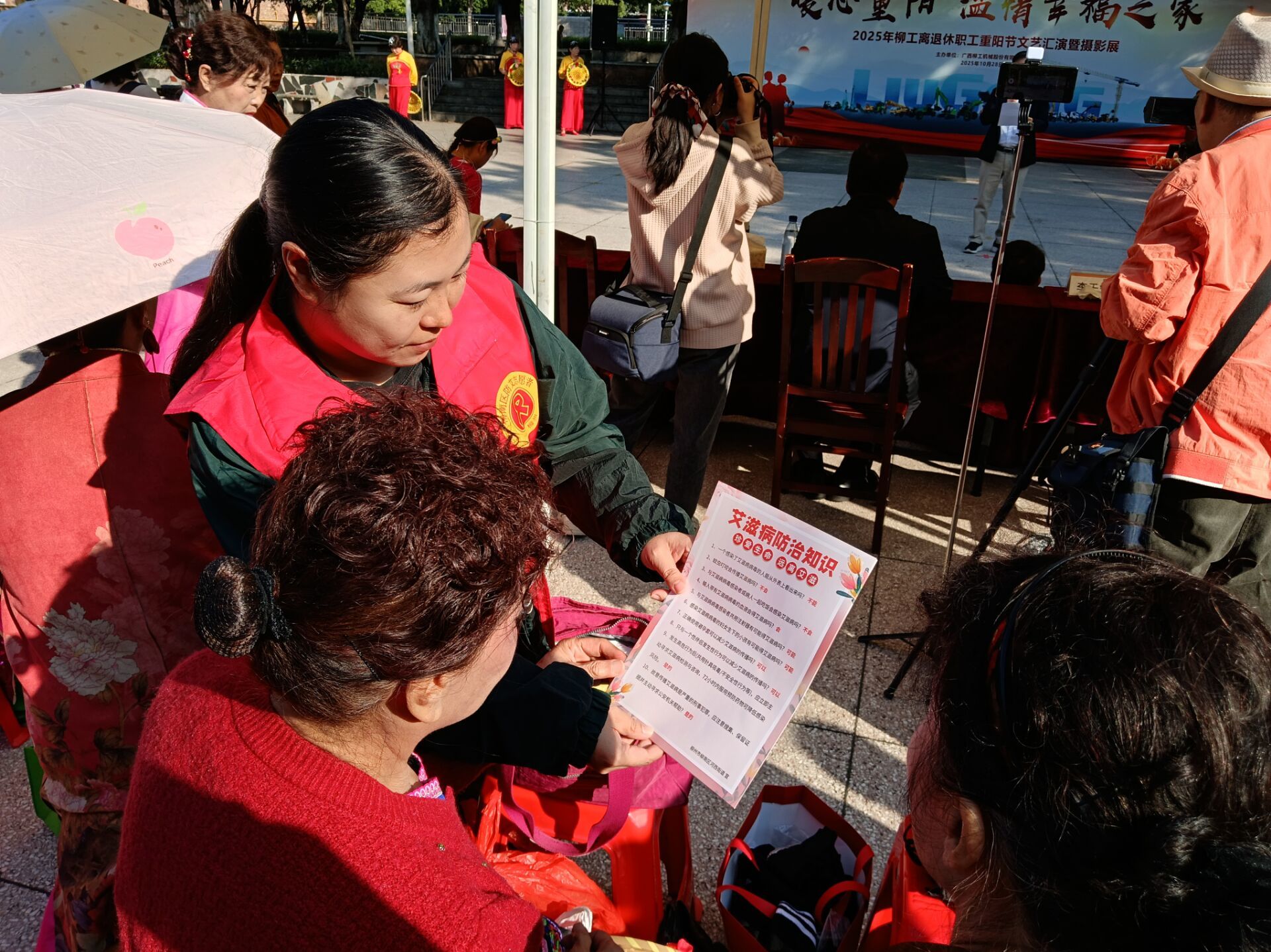 10月28日,柳南区河西街道柳工社区联合辖区单位柳工工会以中国传统节日“重阳节”为契机,组织辖区的退休人员举办了一场主题为“暖心重阳 温情幸福之家”的文艺汇演暨艾滋病防治知识宣传活动。