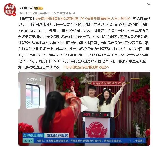 近年来,柳州市积极探索“结婚登记+文旅”模式,依托公园、景区、街道等打造了一批有特色的婚姻登记场所,2025年1月至10月,全市共办理结婚登记14874对,同比增长15.97%,其中跨区域通办结婚登记211对,通过“婚姻登记+”服务,推动周边业态联动增收。