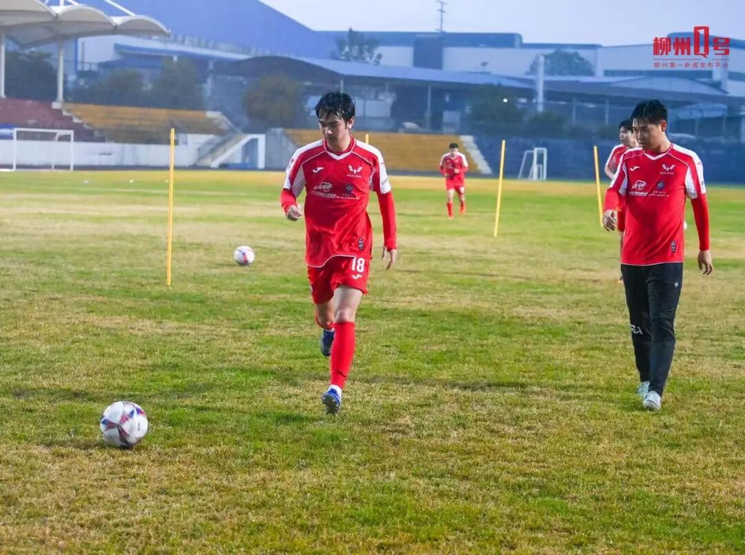 传球训练、射门训练、体能训练……12月23日晚,在瑞龙路旁五菱家园内的足球场上,即将代表柳州参加广西县级足球超级联赛(以下简称广西“县超”)的柳州市柳南区代表队(以下简称“柳南区队”)正在进行训练,他们的首场广西“县超”比赛将在明年1月上旬开赛,客场对阵同城的融水苗族自治县队(以下简称“融水队”)。