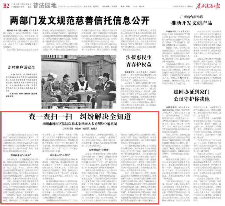 2026年1月18日,《广西法治日报》刊发报道《查一查扫一扫 纠纷解决全知道——柳州市柳南区法院以样本案例嵌入多元纠纷化解机制》,聚焦柳南区人民法院创新运用“样本案例指导手册”及配套二维码系统,将司法智慧深度融入基层社会治理的生动实践。全文如下: