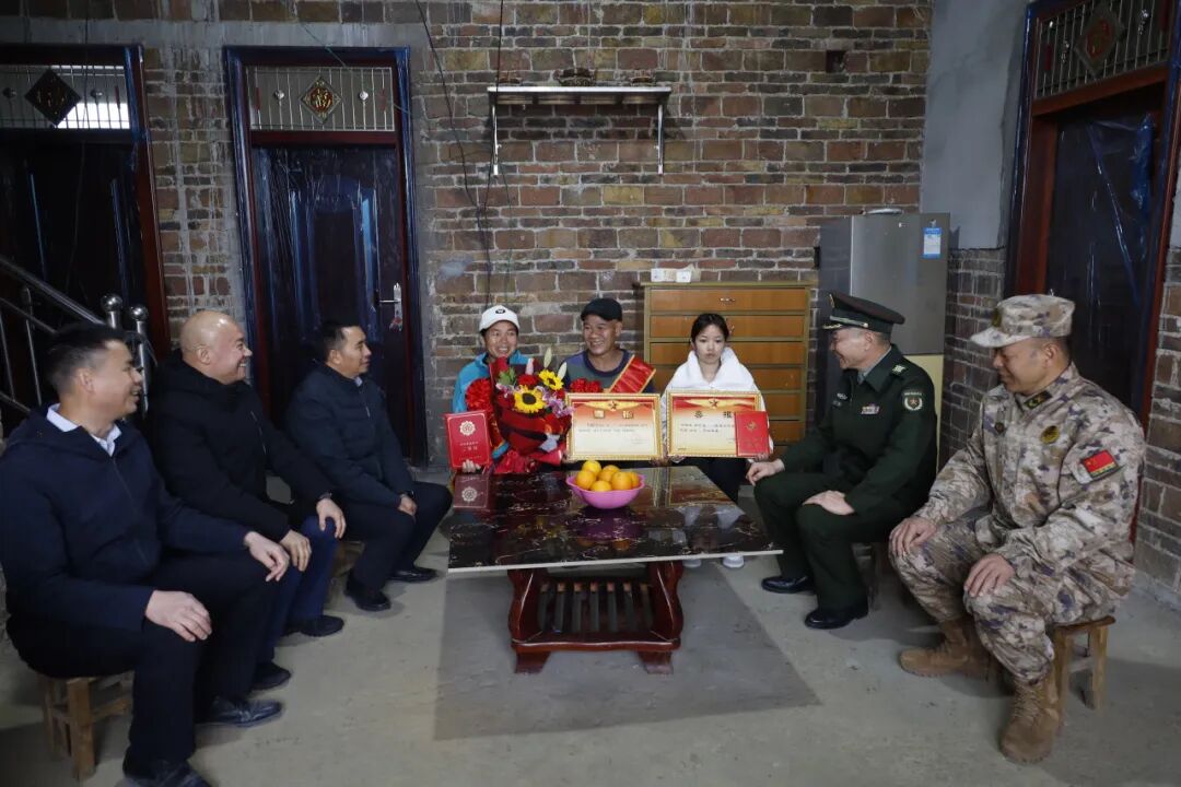 在洛满镇古洲村,慰问组与韦德生家属亲切座谈,细致了解家属生活近况与实际需求,感谢家属为国防事业默默奉献、培养出优秀军人。韦德生2024年入伍,2025年荣立三等功1次,“四有”优秀士兵1次。韦德生父母激动又自豪,表示会继续支持孩子在军营安心服役、争取更好成绩。