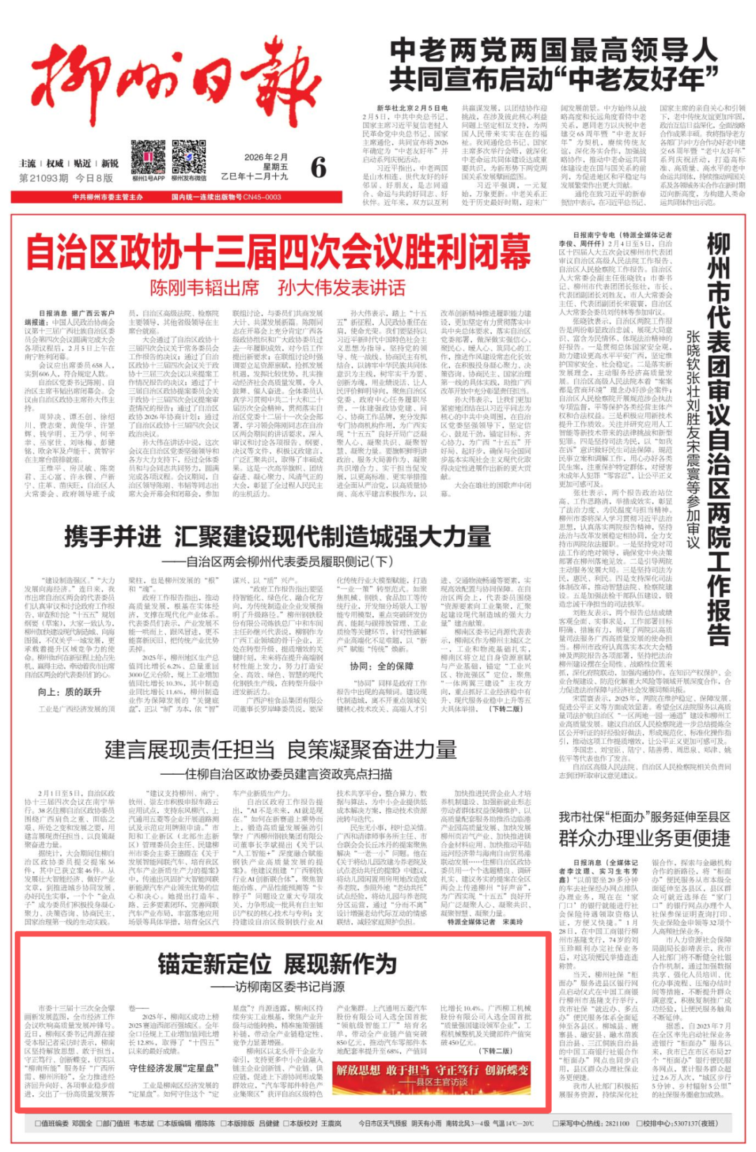 2月6日,《柳州日报》头版刊发《锚定新定位 展现新作为——访柳南区委书记肖源》,关注柳南区高质量发展成效与规划。2025年,柳南区成功上榜2025赛迪西部百强城区。全年全口径规上工业增加值同比增长12.8%,取得了“十四五”以来的最好成绩。柳南区将锚定 “工业兴区、物流强区” 定位,以实体经济为基,培育新质生产力,推动工业与物流协同发展,奋力开启 “十五五” 发展新征程。全文如下: