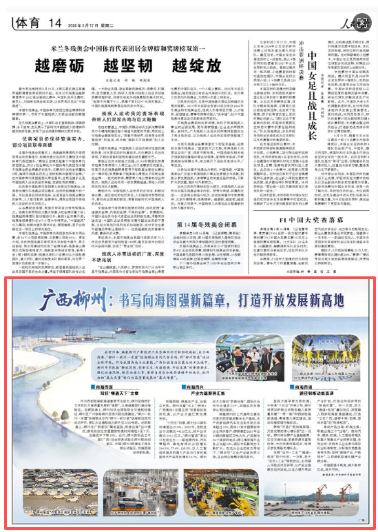 3月17日,《人民日报》14版刊发《广西柳州:书写向海图强新篇章,打造开放发展新高地》一文,文章以半个版面篇幅报道了柳州当前正牢牢把握“解放思想、创新求变,向海图强、开放发展”的重要要求,强化向海思维、做实向海文章,重塑自身在全球价值链中的地位,把开放的“最大变量”转化为高质量发展的“最大增量”。