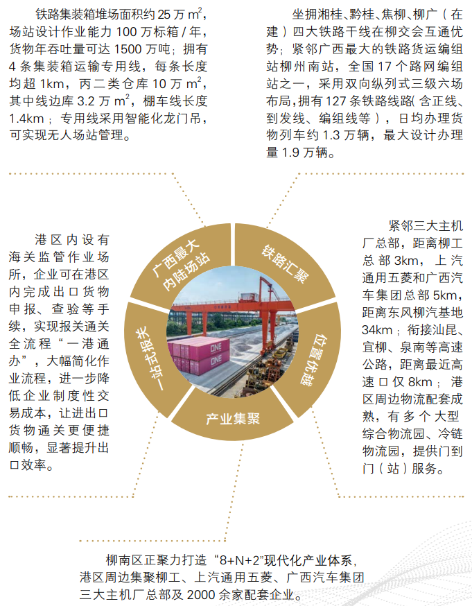 港区定位:柳州铁路港位于西部陆海新通道关键节点,是集多式联运、仓储、配送、金融交易于一体的生产服务型国家物流枢纽,助力汽车、工程机械等产业形成“陆海内外联动、东西双向互济”的对外开放格局。