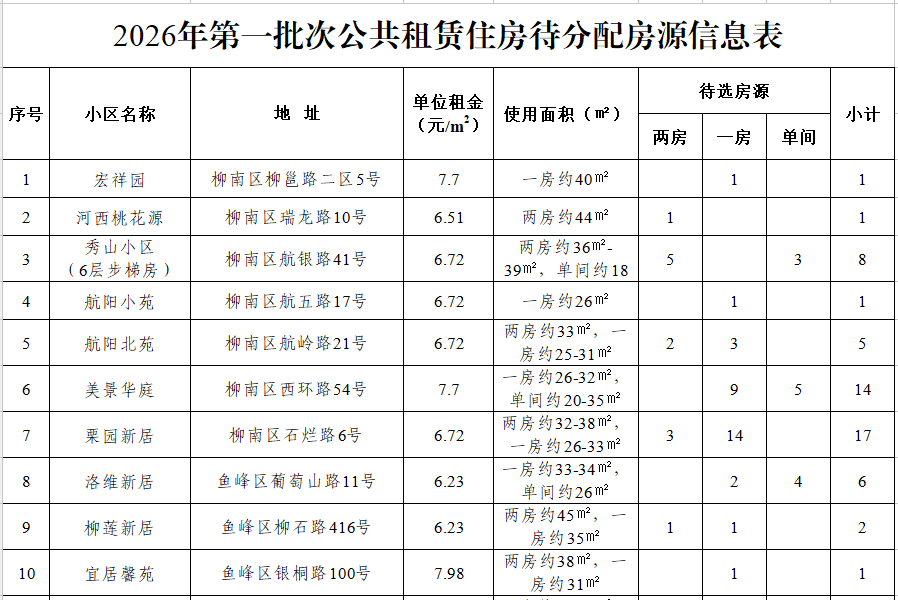 近日,柳州市2026年第一批次公共租赁住房分配公告发布,本批次可分配房源共计548套,拟定于3月27日开展选房。