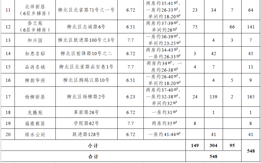 本批次可分配房源共计548套,分布在全市20个小区,其中两房一厅149套,一房一厅304套,单间95套。
