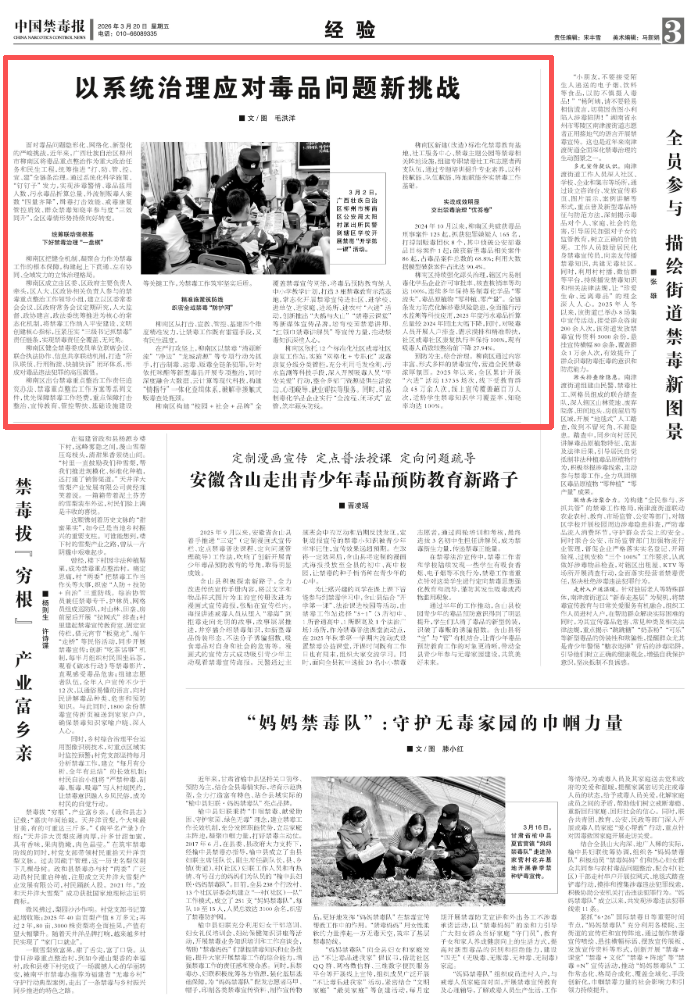 3月20日,《中国禁毒报》刊发《以系统治理应对毒品问题新挑战》,报道关注柳州柳南区应对毒品新型化、网络化挑战,统筹推进 “打、防、管、控、宣、建” 全链条治理。该区健全联动机制、压实各级责任,运用科技精准打击、全域宣传、严管严控,实现 “四量齐降、三效同升”,毒情持续向好,交出实战成效突出的禁毒治理答卷。全文如下: