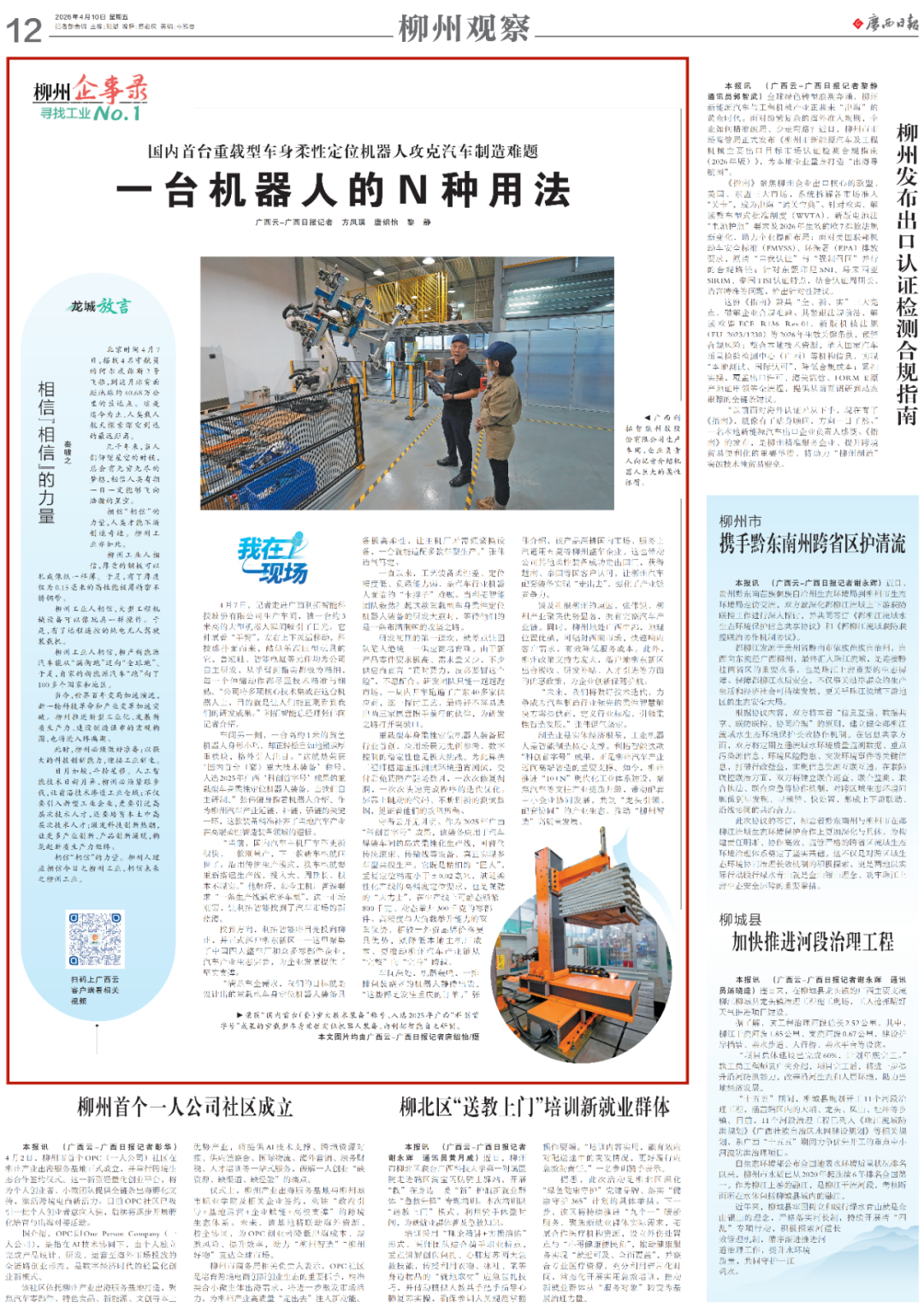 4月10日,《广西日报》“柳州企事录”专栏在版面头条刊发《国内首台重载型车身柔性定位机器人攻克汽车制造难题——一台机器人的N种用法》,报道关注广西利拓智能科技股份有限公司自主研制的“重载型车身柔性定位机器人装备”获评“国内首台(套)重大技术装备”及2025年广西“科创首字号”成果。该装备解决了目前汽车行业工艺装备柔性差、定位精度低、负载能力弱等难题,补齐了柳州汽车产业在高端柔性智造装备领域的短板,在降低主机厂成本的同时,推动产业链从“完整”向“完善”跨越。