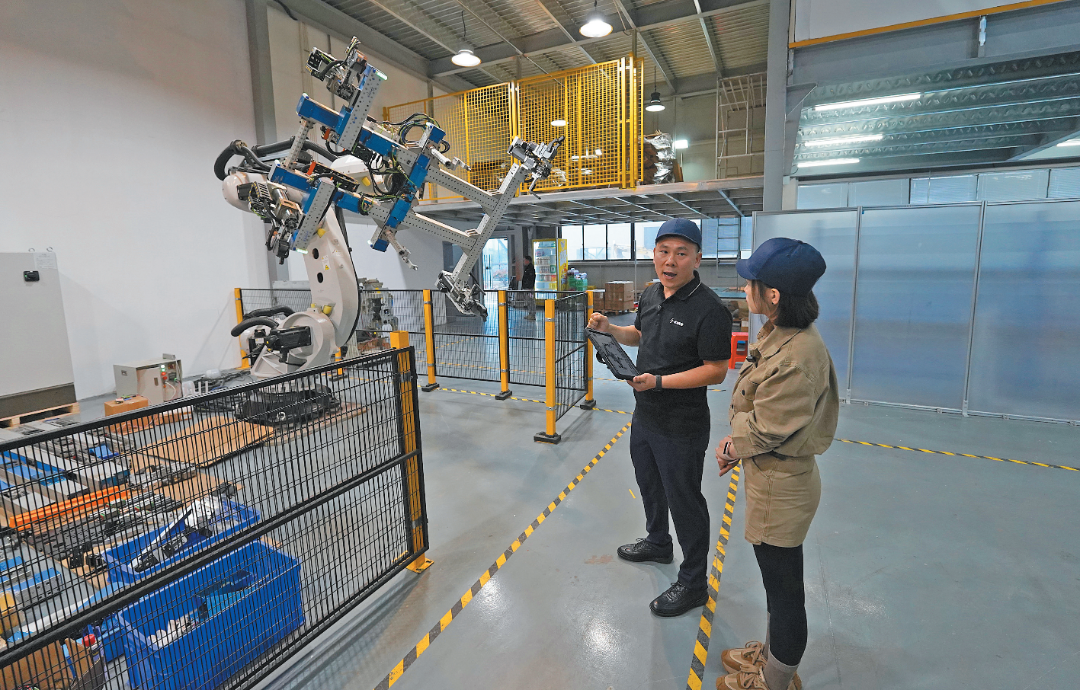 广西利拓智能科技股份有限公司生产车间,企业负责人向记者介绍机器人巨大的柔性抓臂。