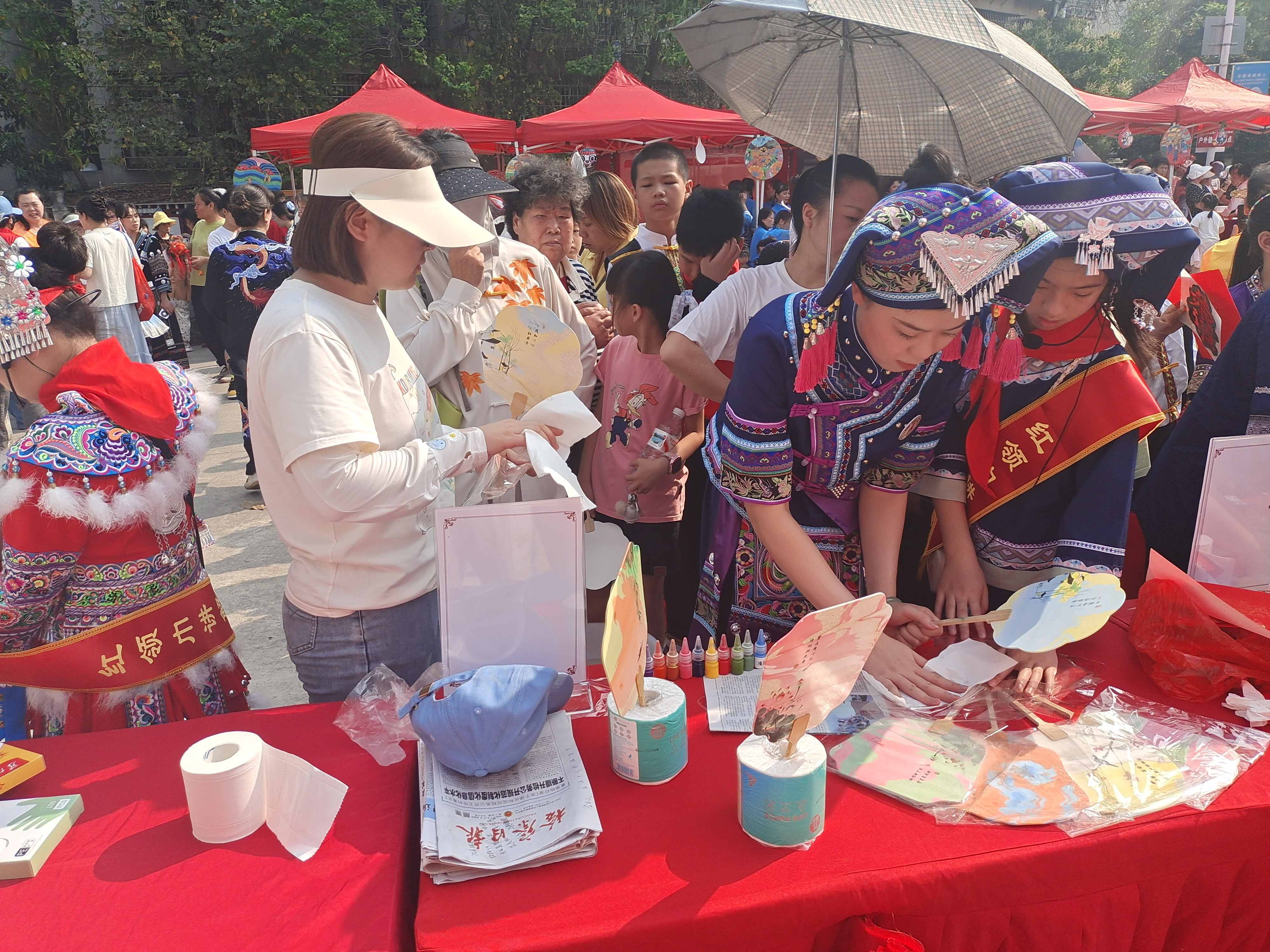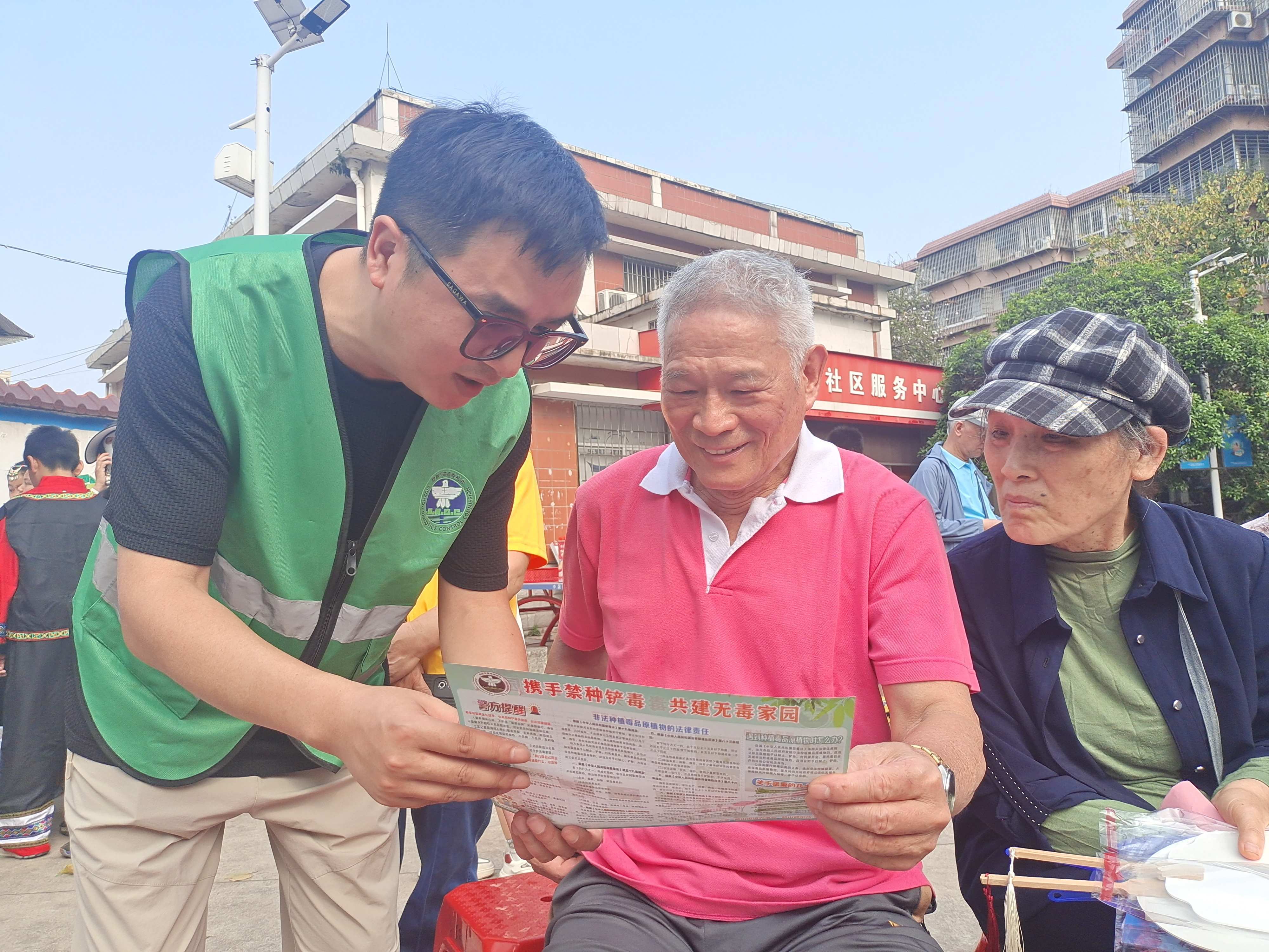 活动现场热闹非凡,文艺汇演精彩纷呈,抛绣球、投壶等民俗游戏趣味十足,扎染、漆扇、拓印等非遗体验区人气高涨,特色美食琳琅满目,各族群众欢聚一堂共庆佳节。在浓厚的节日氛围中,身着绿马甲的禁毒社工格外醒目,社工向居民发放禁种铲毒专属宣传彩页,面对面细致讲解毒品原植物辨识要点,重点普及罂粟外观特征、常见种植误区、发现罂粟的举报途径,以及非法种植毒品原植物需承担的法律责任,用通俗易懂的语言普及源头禁毒知识。鹅山派出所民警同步开展反诈宣传,结合典型案例以案释法,现场答疑解惑,提醒居民警惕各类诈骗陷阱,提升安全防范意识。