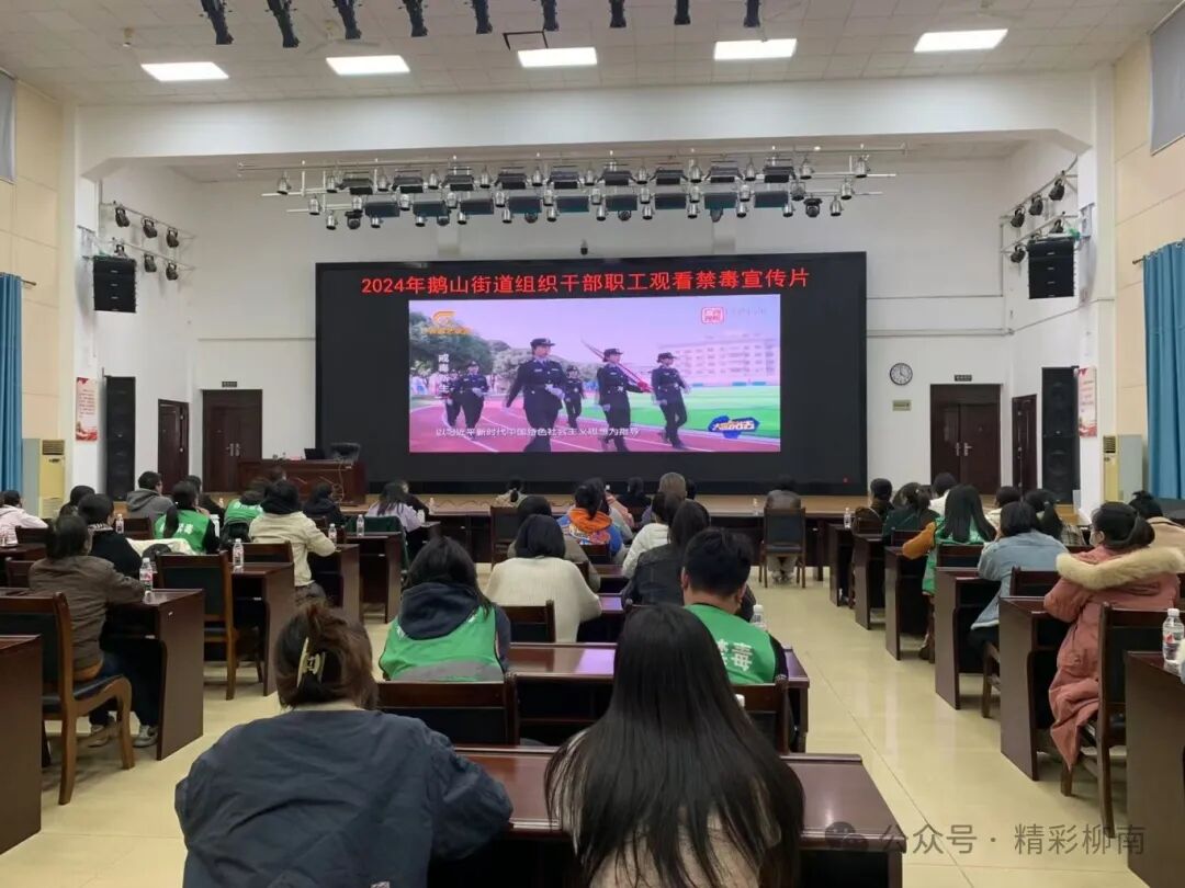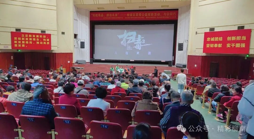 11月22日晚,南站街道组织辖区400多名居民在柳铁工人文化宫观看禁毒教育影片《扫毒》。
