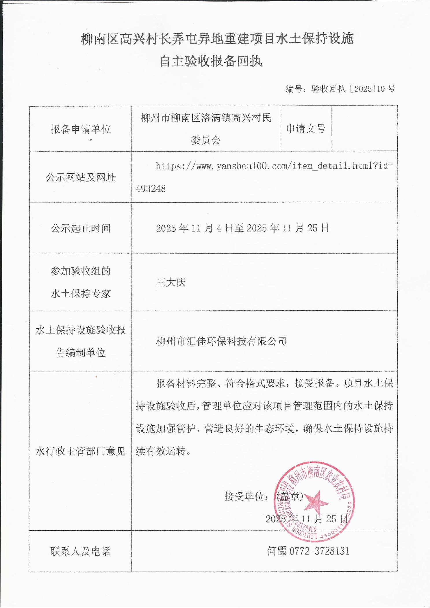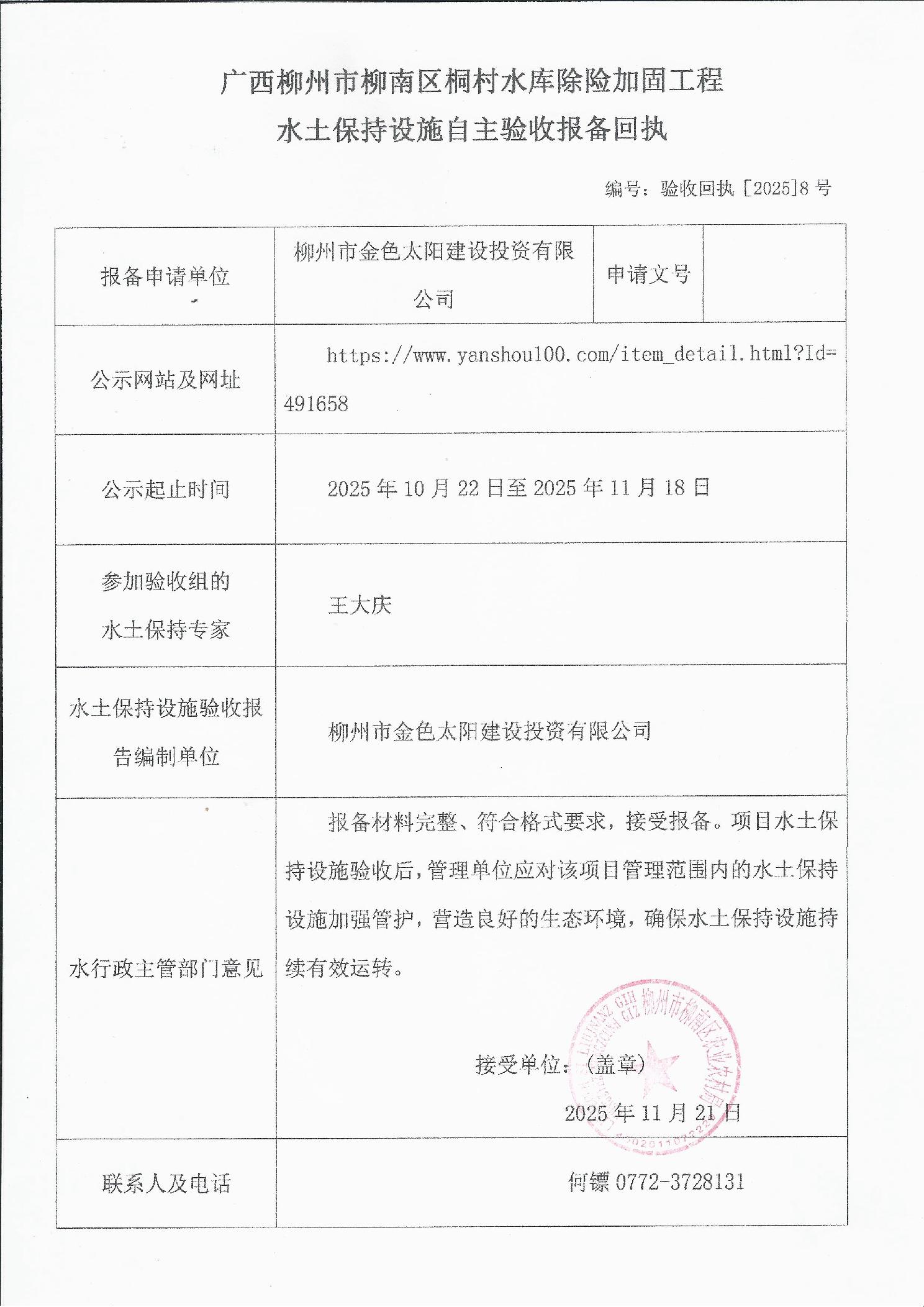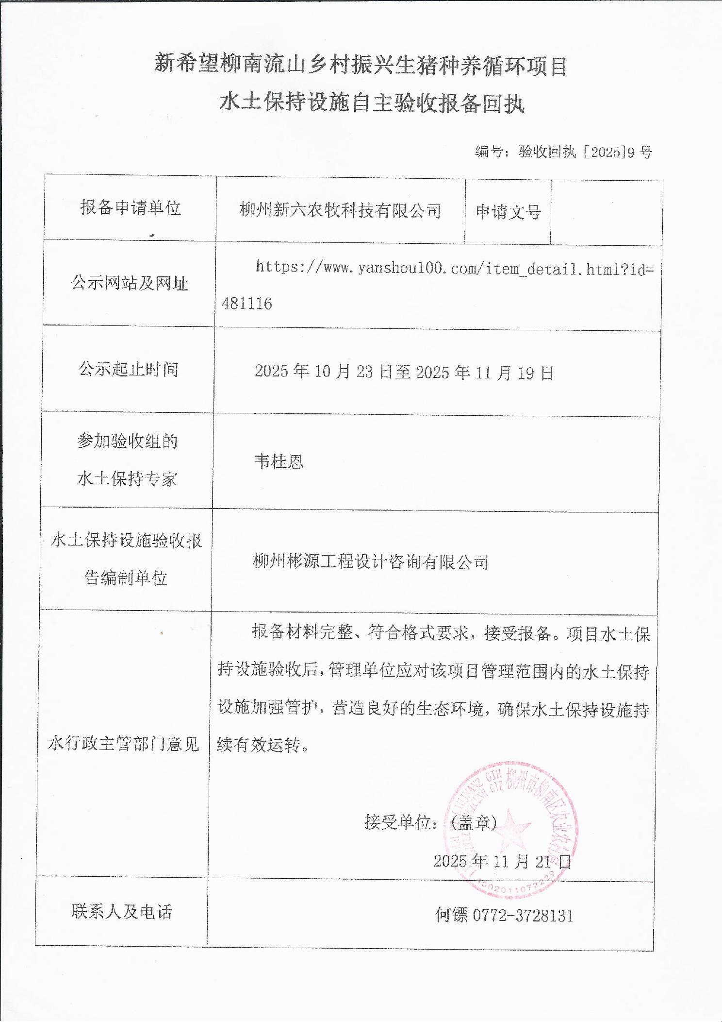 建设项目水土保持设施自主验收报备回执公示(2025年11月)