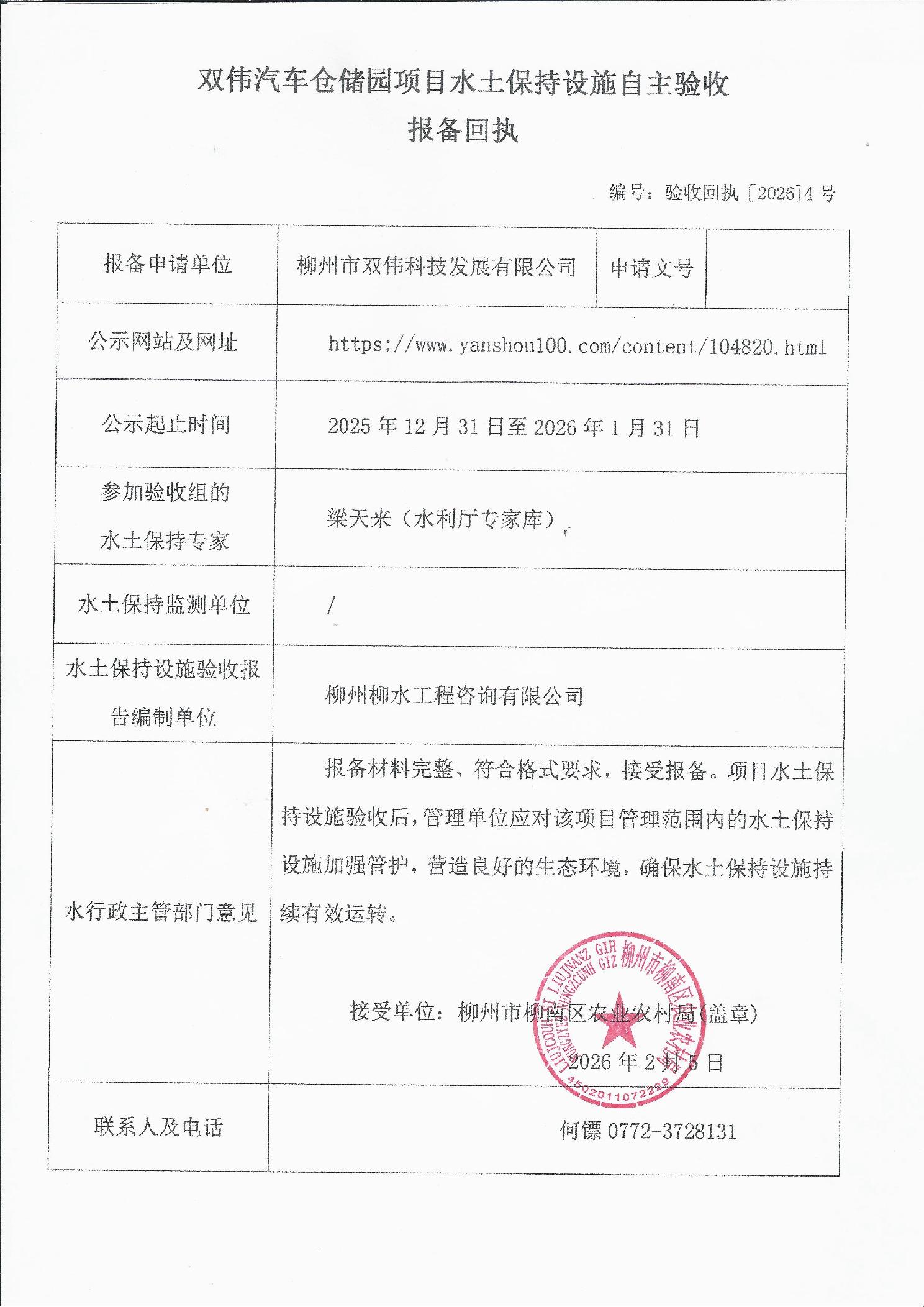 双伟汽车仓储园项目水土保持设施自主验收报备回执公示