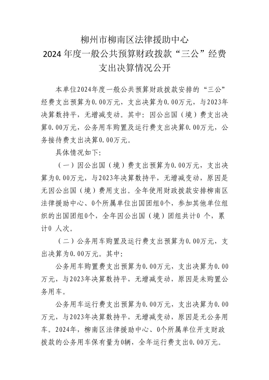 柳州市柳南区法律援助中心2024年度一般公共预算财政拨款“三公”经费支出决算情况公开