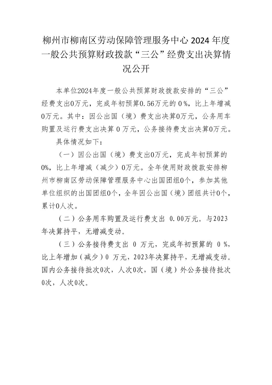 柳州市柳南区劳动保障管理服务中心2024年度一般公共预算财政拨款“三公”经费支出决算情况公开