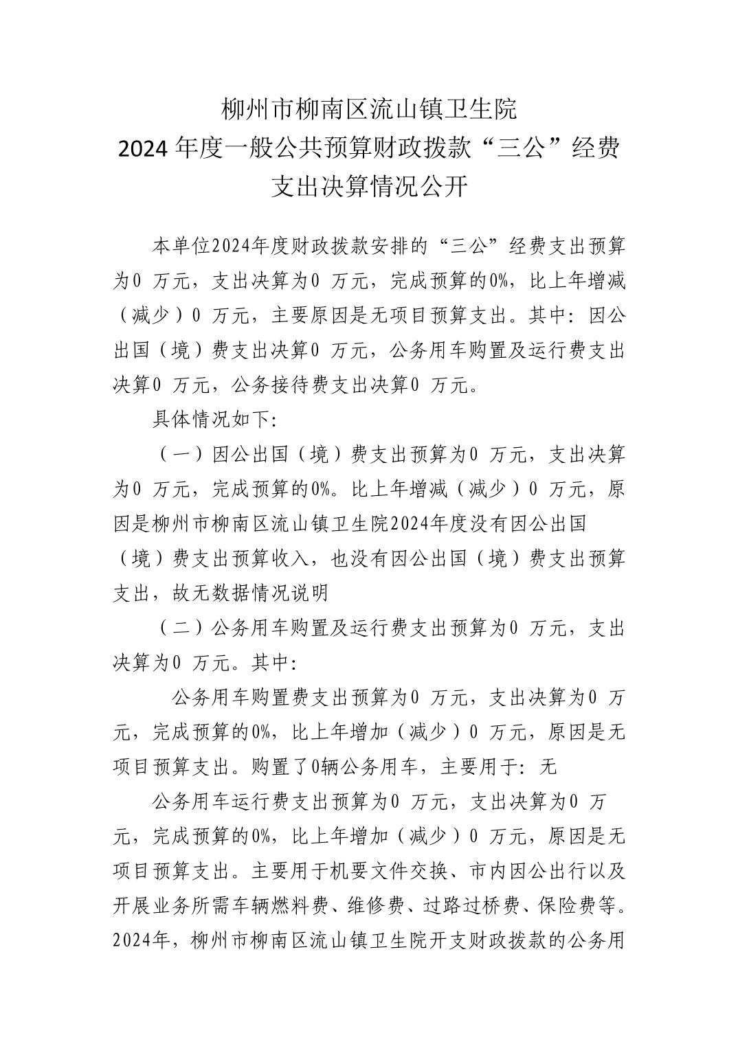 柳州市柳南区流山镇卫生院2024年度一般公共预算财政拨款“三公”经费支出决算情况公开