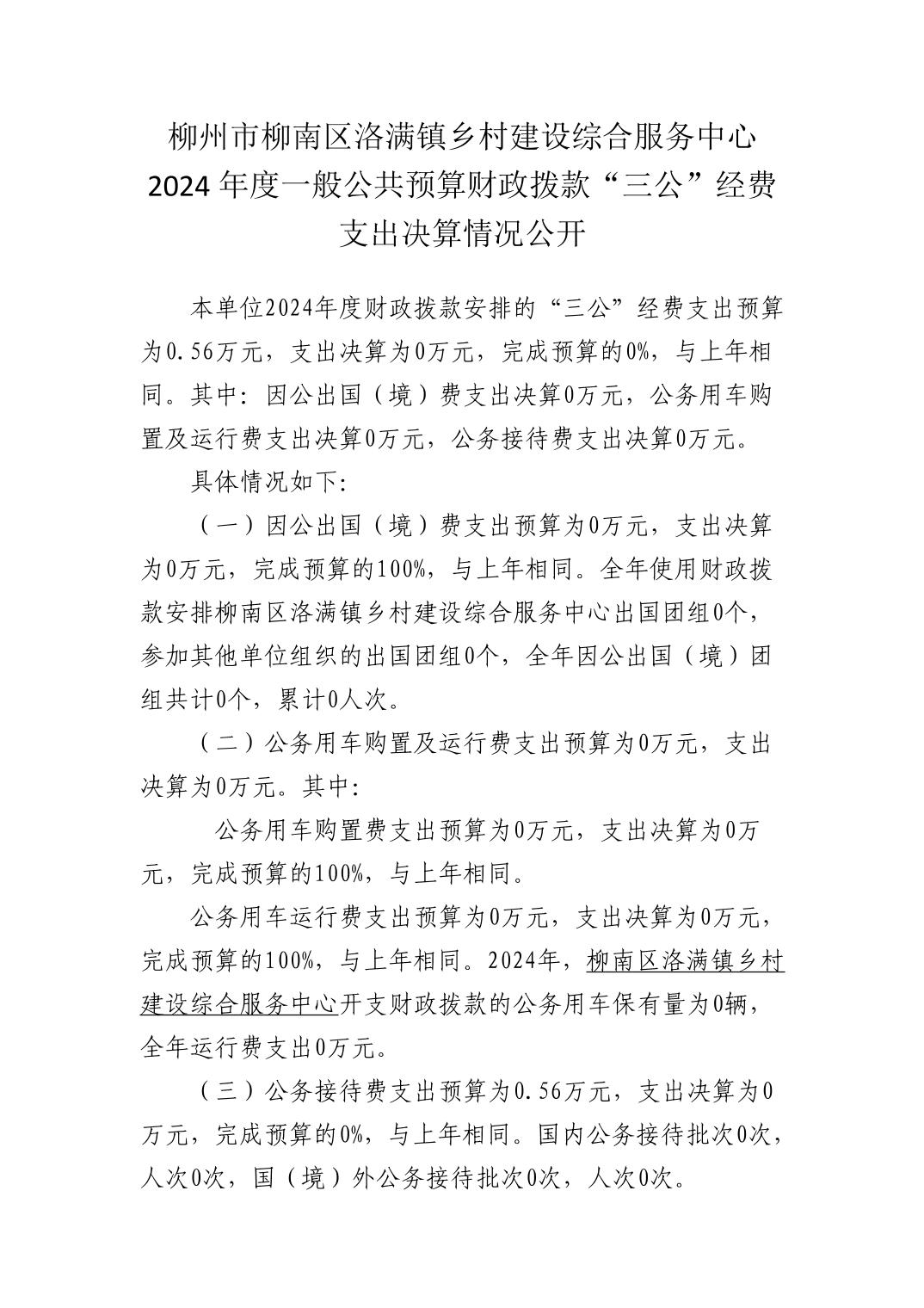 柳州市柳南区洛满镇乡村建设综合服务中心2024年度一般公共预算财政拨款“三公”经费支出决算情况公开