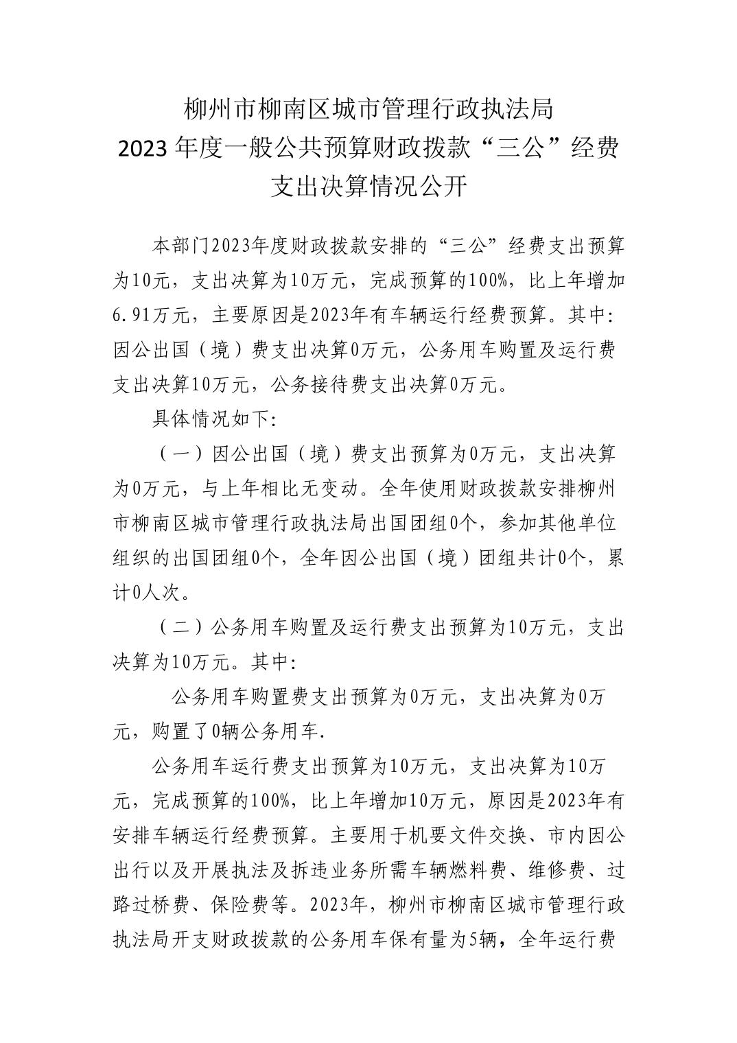 柳州市柳南区城市管理行政执法局2023年度一般公共预算财政拨款“三公”经费支出决算情况公开