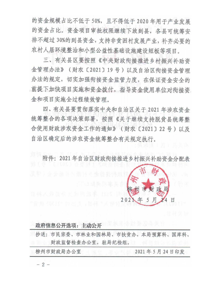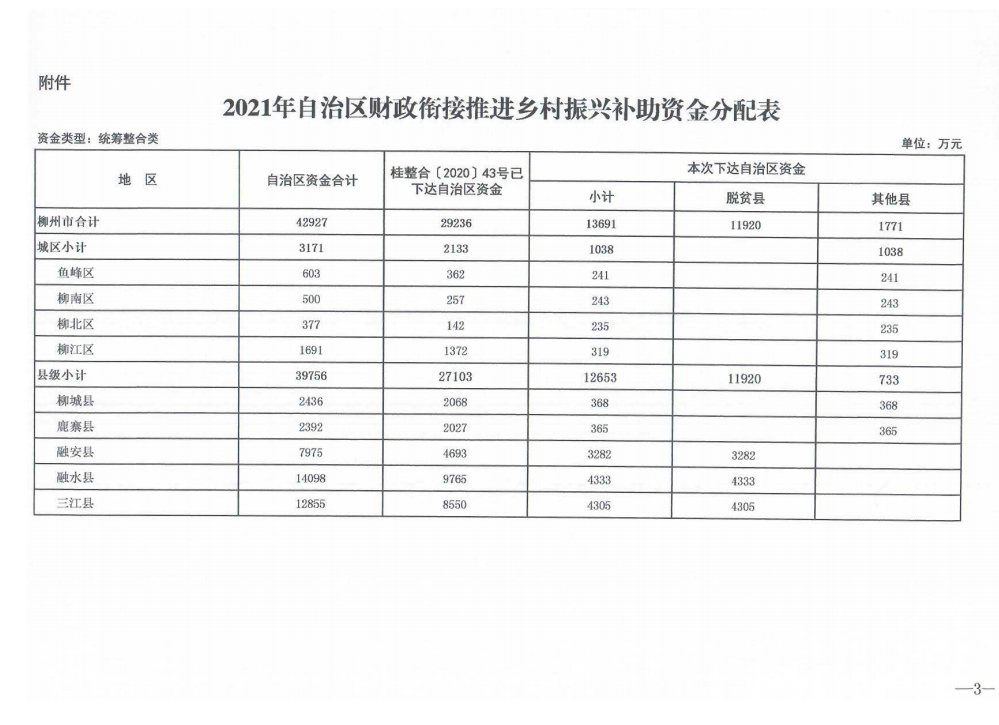 柳财预追〔2021〕185号 关于下达2021年自治区财政衔接推进乡村振兴补助资金的通知