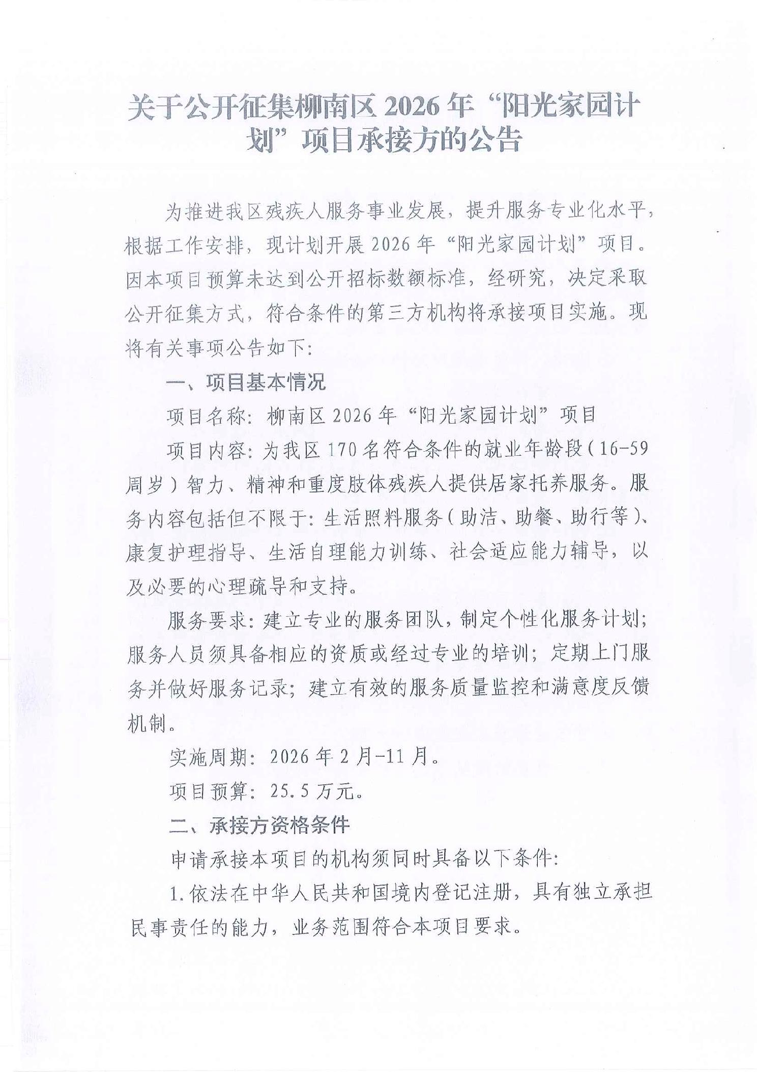 关于公开征集柳南区2026年“阳光家园计划”项目承接方的公告