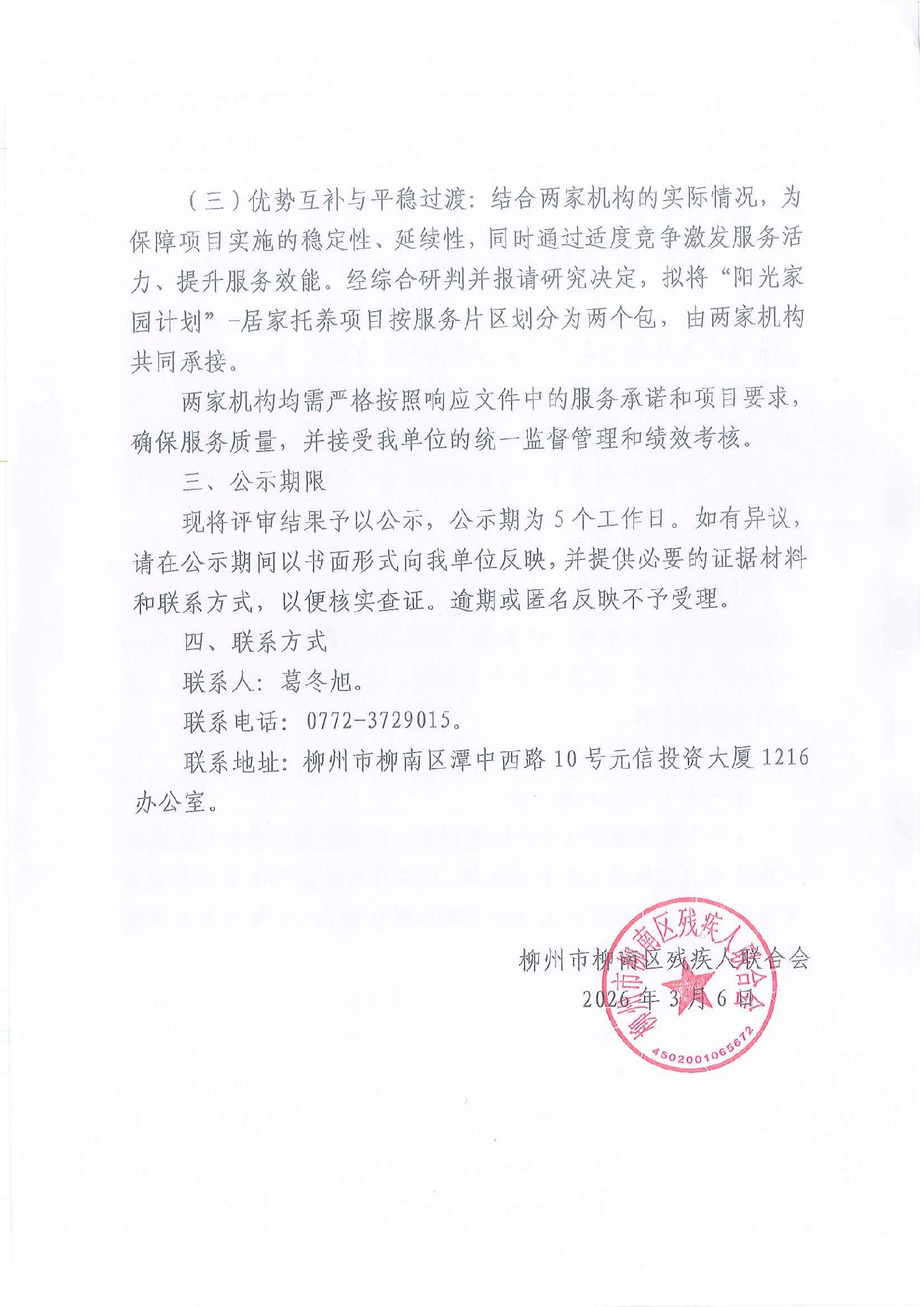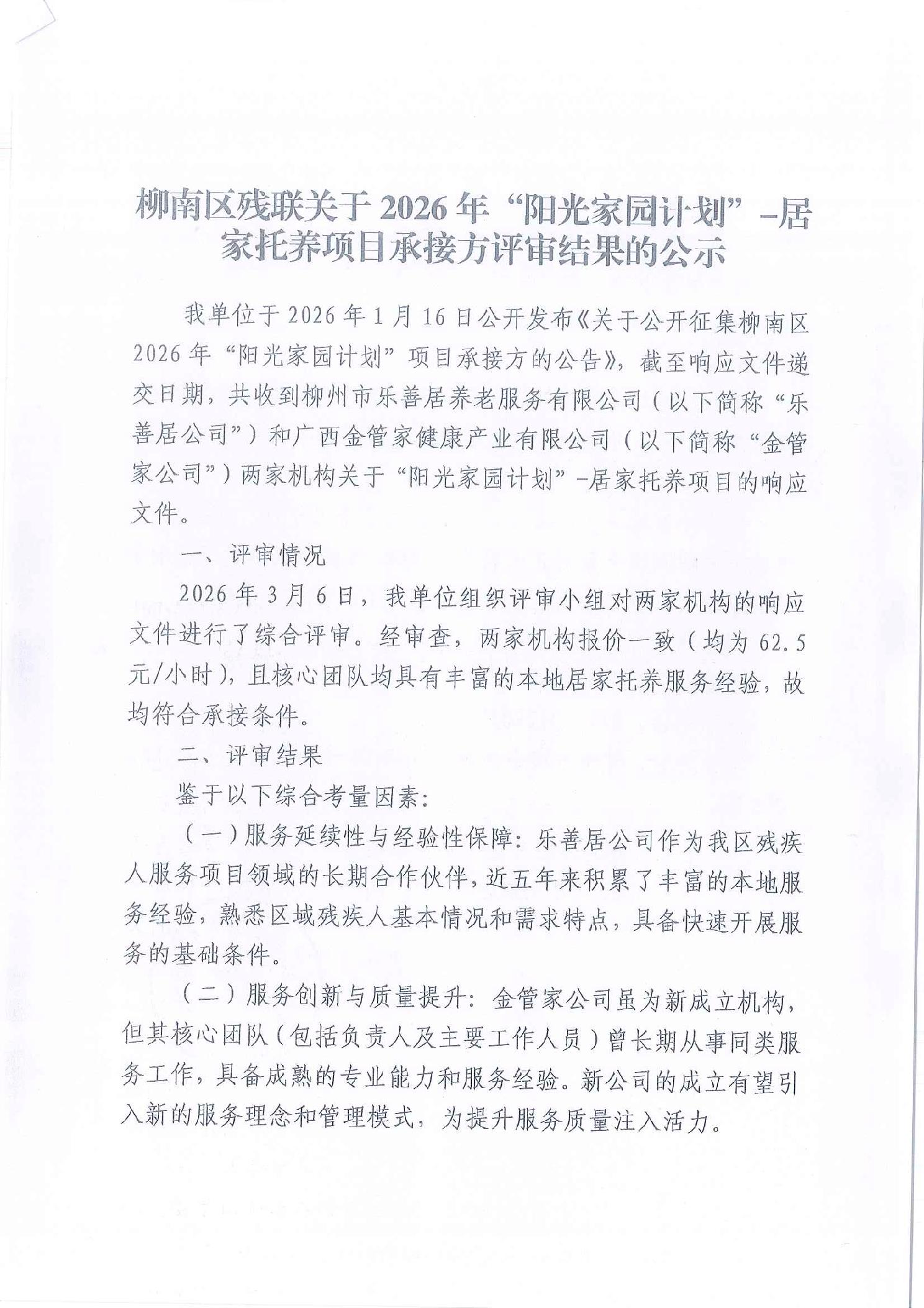 柳南区残联关于2026年“阳光家园计划”-居家托养项目承接方评审结果的公示