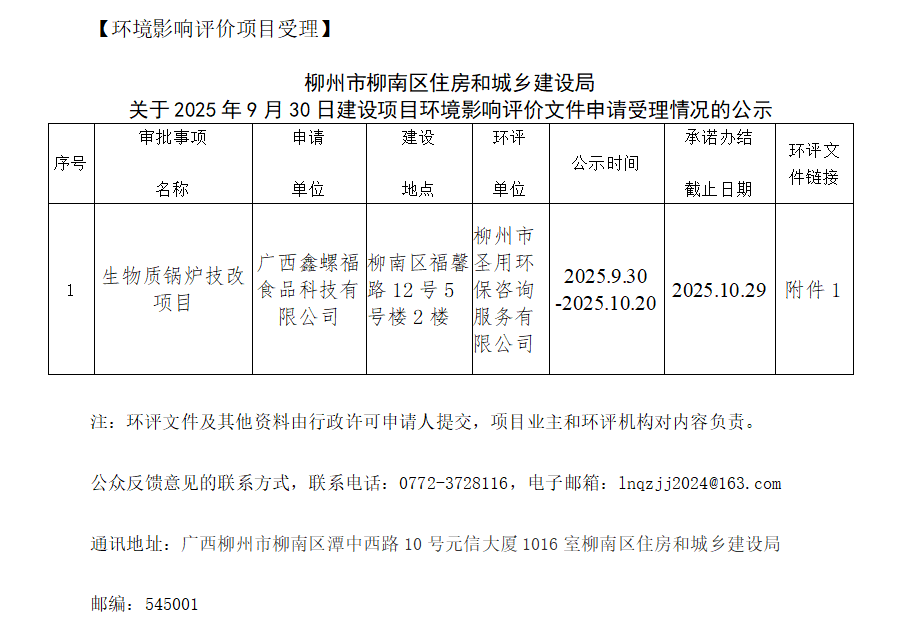 2025年9月30日生物质锅炉技改建设项目环境影响评价文件申请受理情况的公示