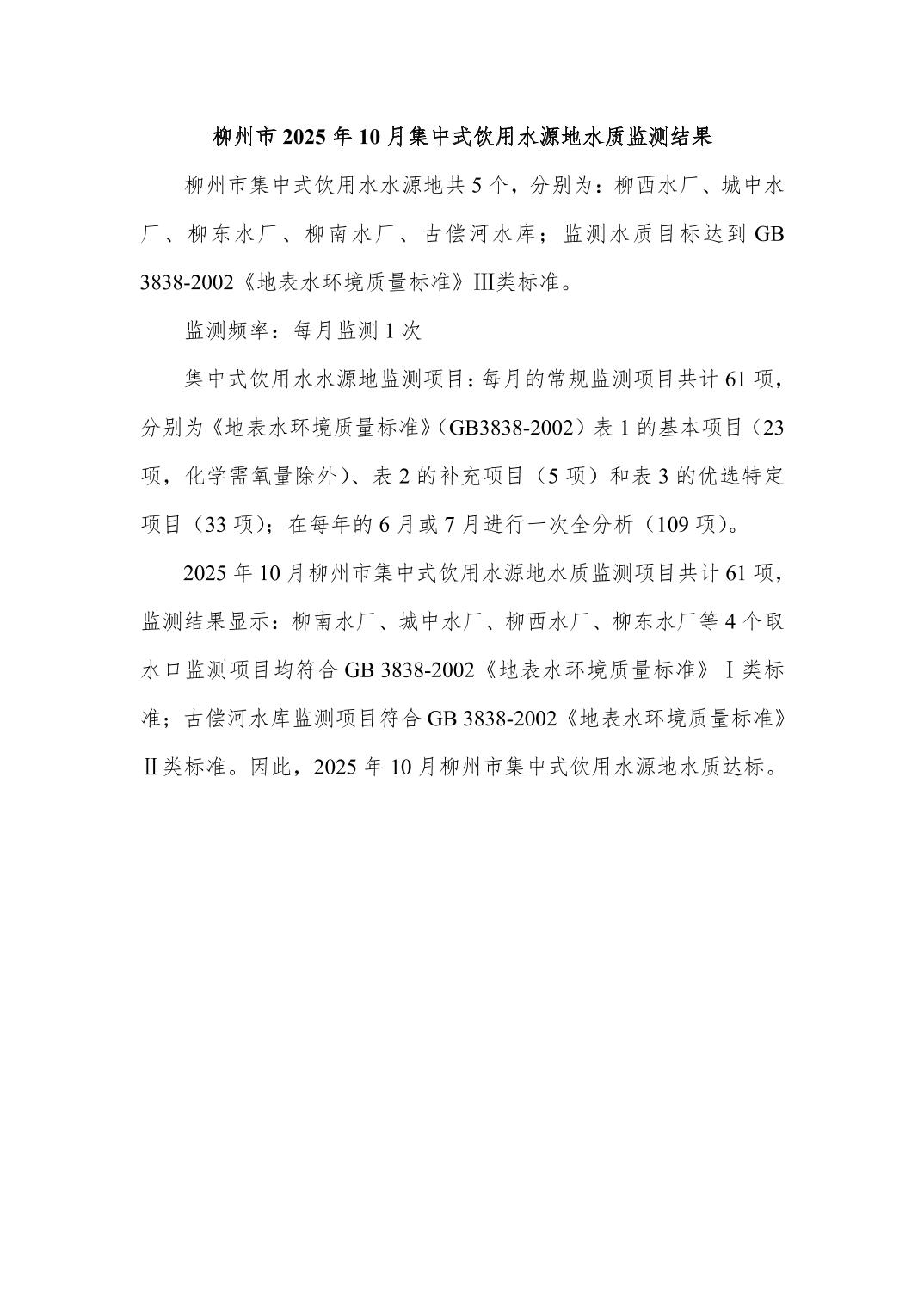 2025年10月集中式饮用水源地水质报告