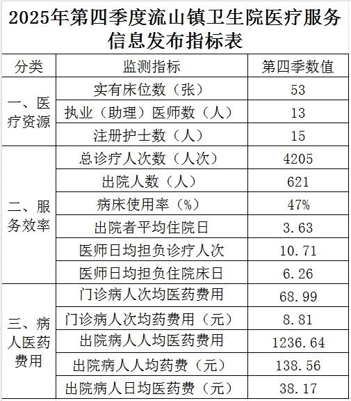 2025年第四季度流山镇卫生院医疗服务信息发布指标表
