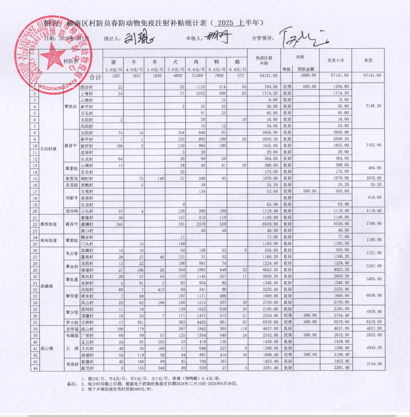 柳南区村防员春防动物免疫注射补贴统计表公示(2025上半年)
