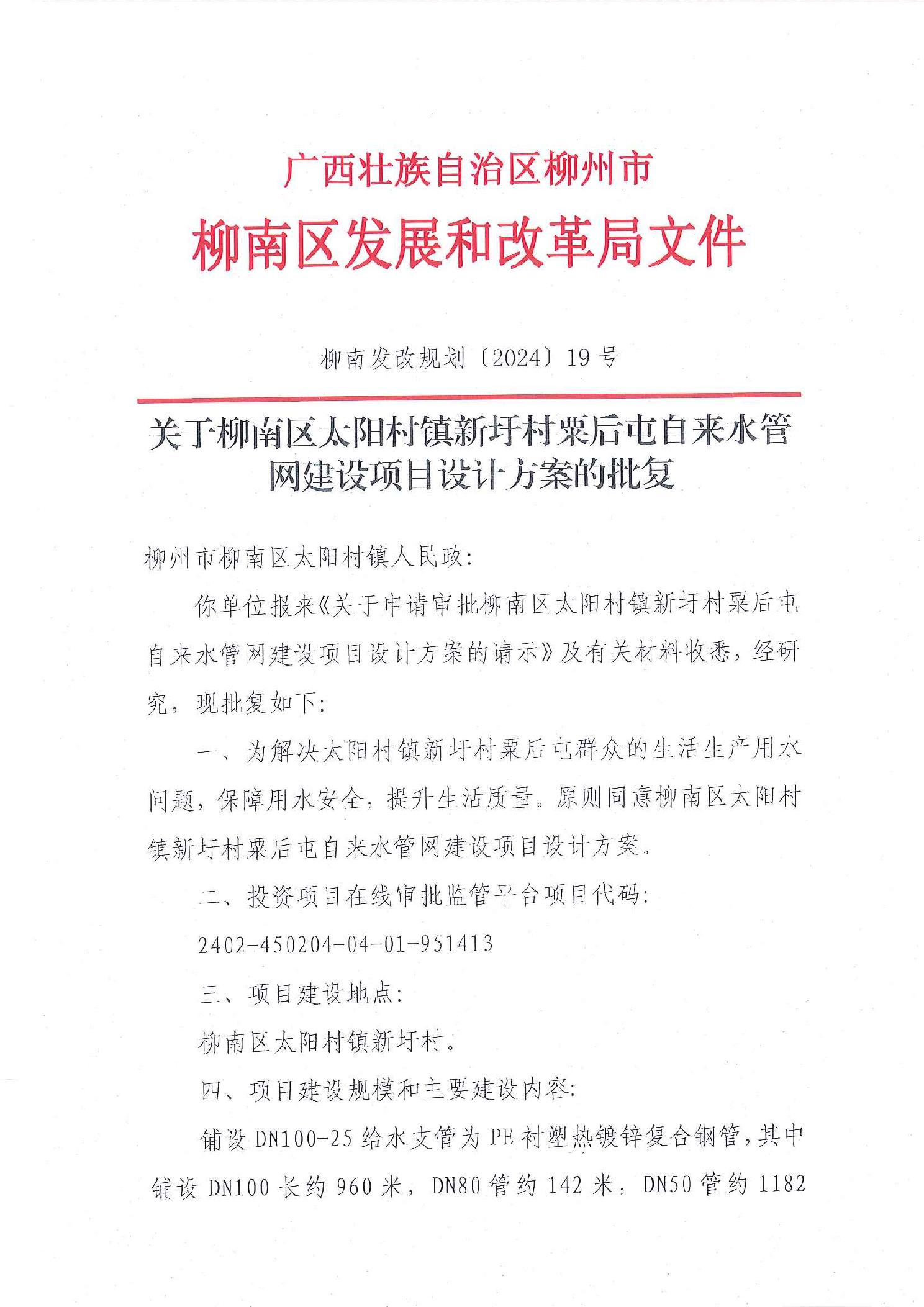 柳南发改规划[2024]19号 柳南区太阳村镇新圩村粟后屯自来水管网建设项目设计方案设计方案批复