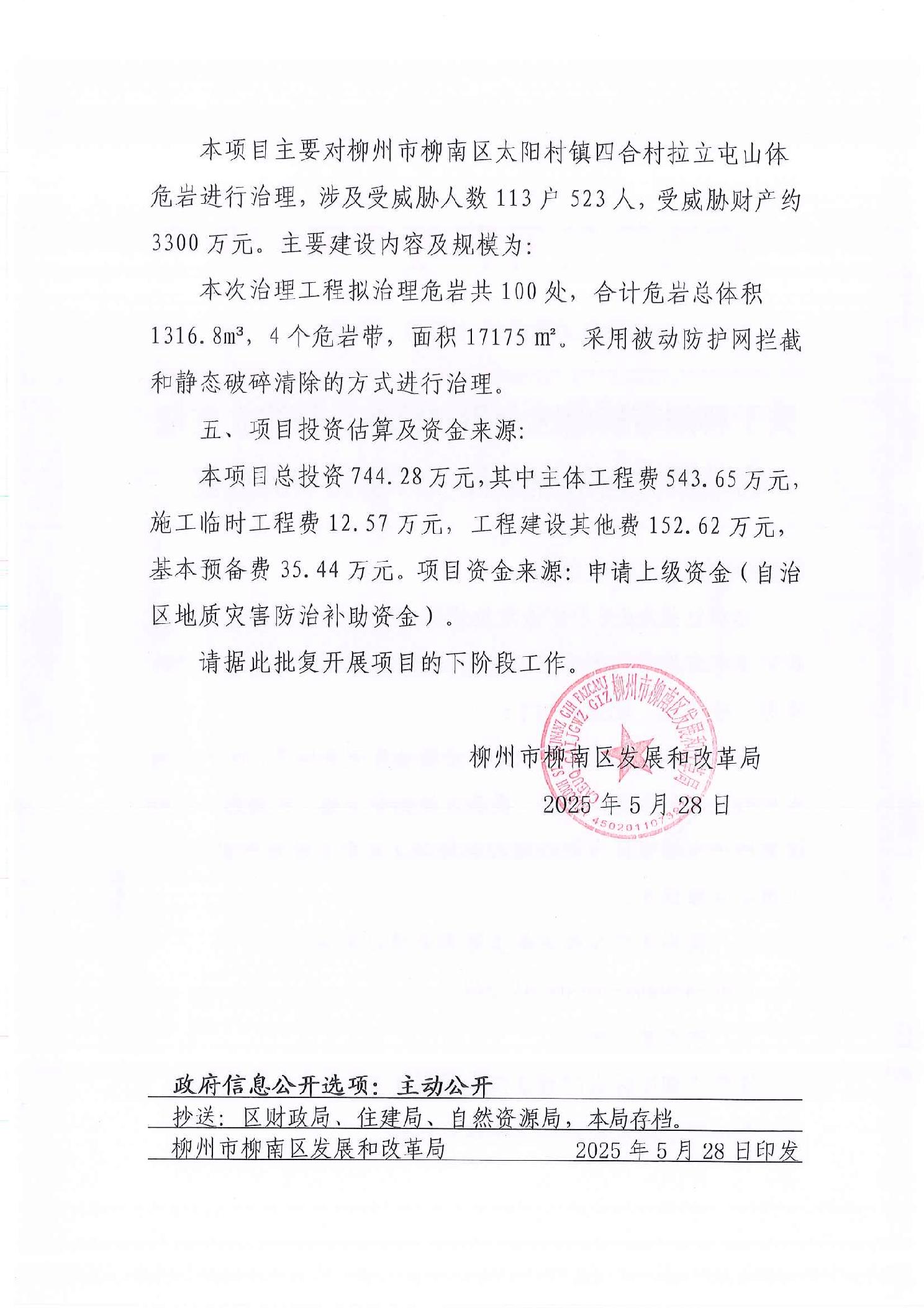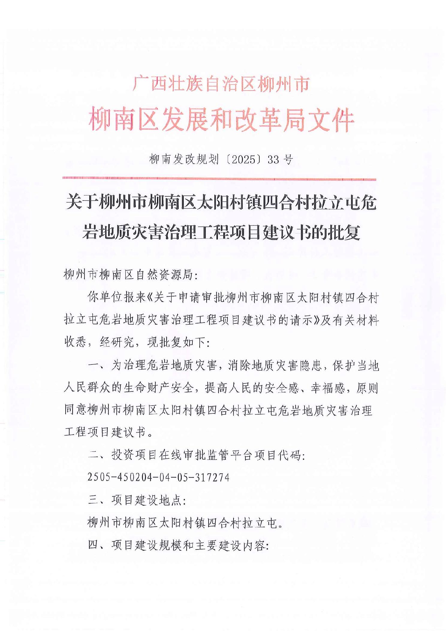 柳南发改规划(2025)33号 关于柳州市柳南区太阳村镇四合村拉立屯危岩地质灾害治理工程项目建议书的批复