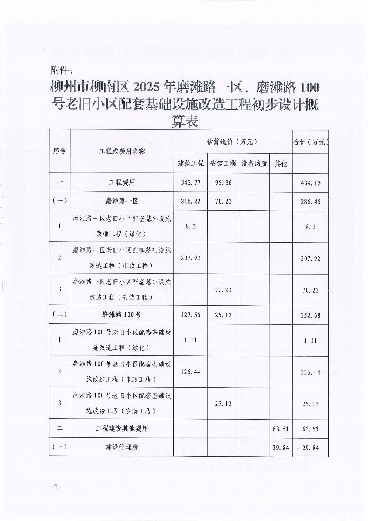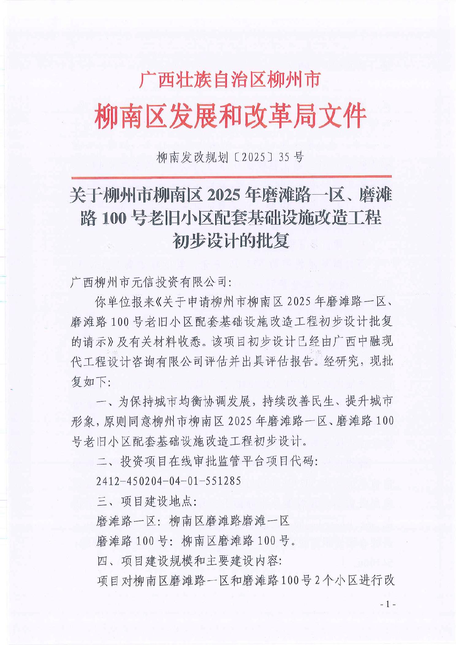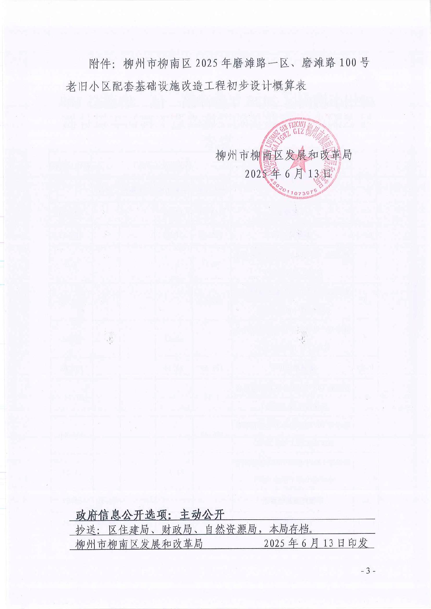柳南发改规划〔2025〕35号关于柳州市柳南区2025年磨滩路一区、磨滩路100号老旧小区配套基础设施改造工程初步设计的批复